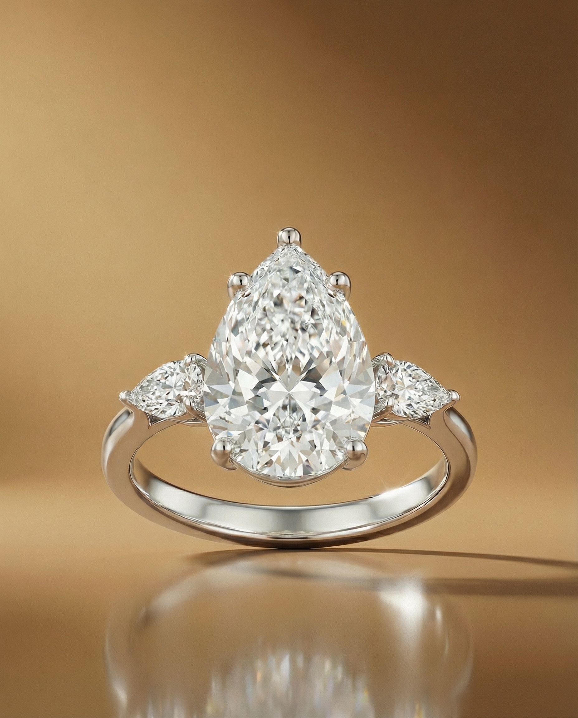 สะท้อนรสนิยมที่โดดเด่นด้วย แหวนเพชรทรงหยดน้ำในดีไซน์ Three-Stone ที่จัดวางเพชรสามเม็ดเรียงต่อกันอย่างสมดุล ตัวเรือนก้านเงาดีไซน์มินิมอลช่วยขับเน้นความระยิบระยับของเพชรให้ดูสะอาดตาและสง่างาม เหมาะสำหรับเป็นแหวนหมั้นหรือแหวนแทนใจในโอกาสพิเศษ
