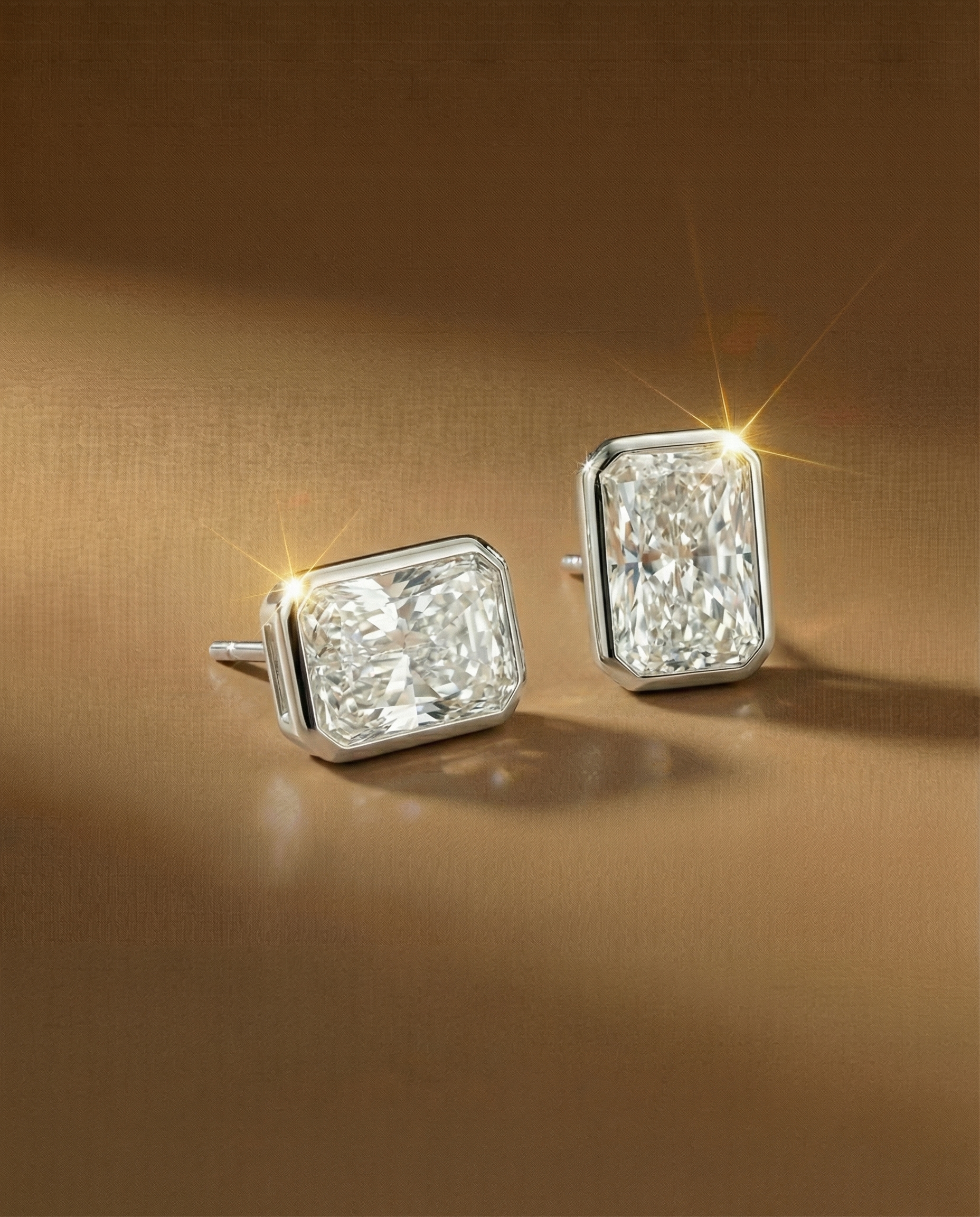 ต่างหูเพชร Radiant Cut ที่ผสานความทันสมัยเข้ากับความหรูหราอย่างลงตัว เพชร Radiant Cut ที่เจียระไนอย่างปราณีต มอบประกายไฟที่งดงามและโดดเด่นสะกดทุกสายตา ฝังในตัวเรือน Modern Bezel ที่ออกแบบมาอย่างพิถีพิถัน ช่วยปกป้องเพชรและเพิ่มความโดดเด่นให้กับรูปทรงสี่เหลี่ยมผืนผ้า