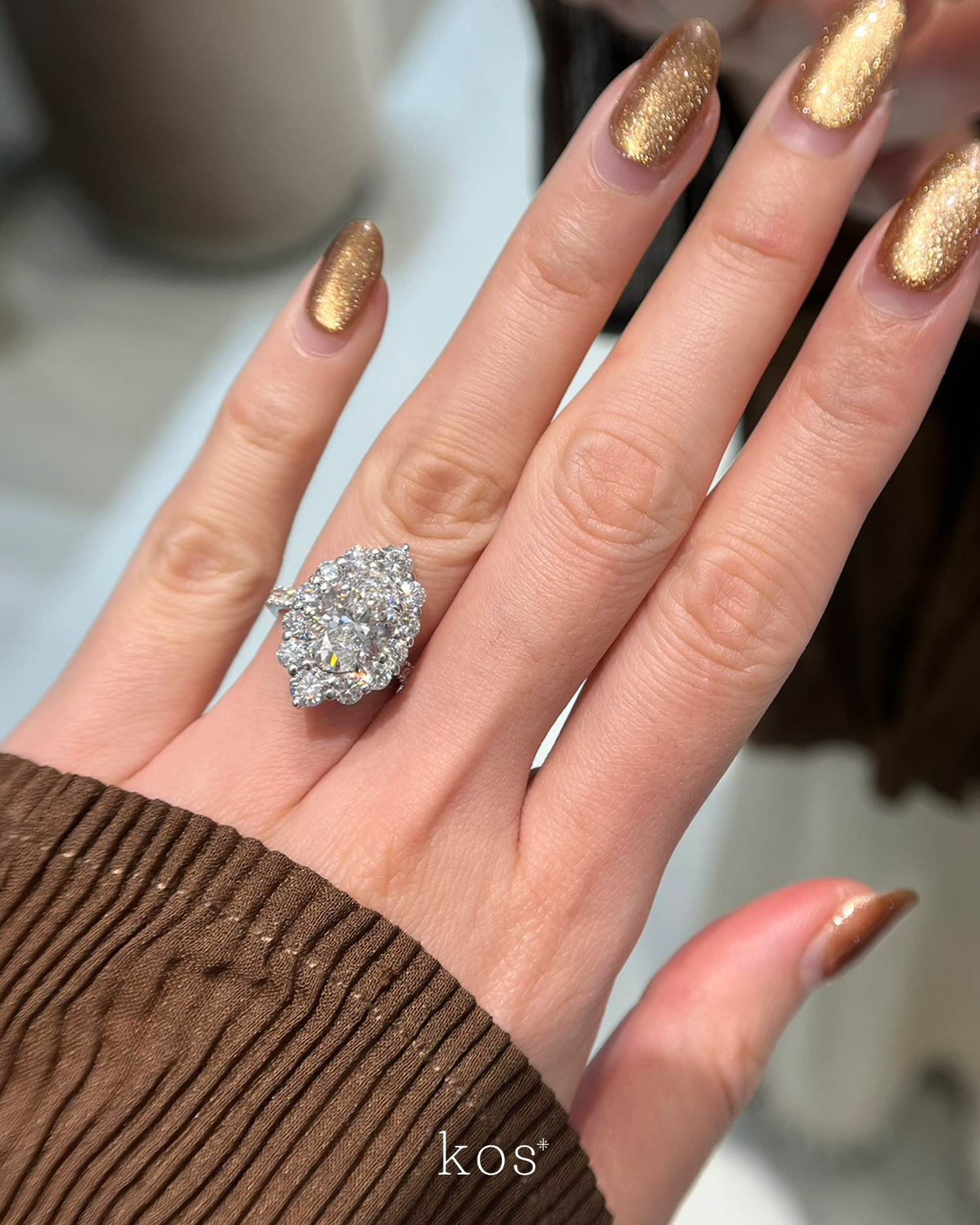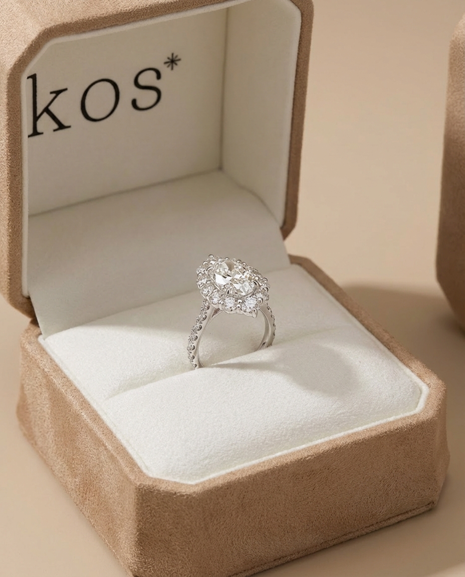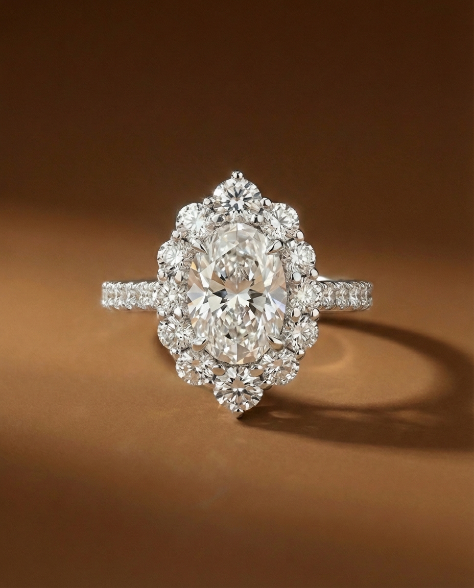 ที่สุดแห่งความสง่างามกับ แหวนเพชรทรง Oval ที่ถูกโอบล้อมด้วยรัศมีแห่งเพชรล้อม (Halo) เสริมให้เพชรเม็ดกลางดูโดดเด่นและมีขนาดใหญ่ขึ้น ตัวเรือนดีไซน์ประณีตด้วยการฝังเพชรละเอียดทั้งบนก้านแหวนและสะพานแหวน มอบประกายไฟที่สมบูรณ์แบบในทุกมิติ