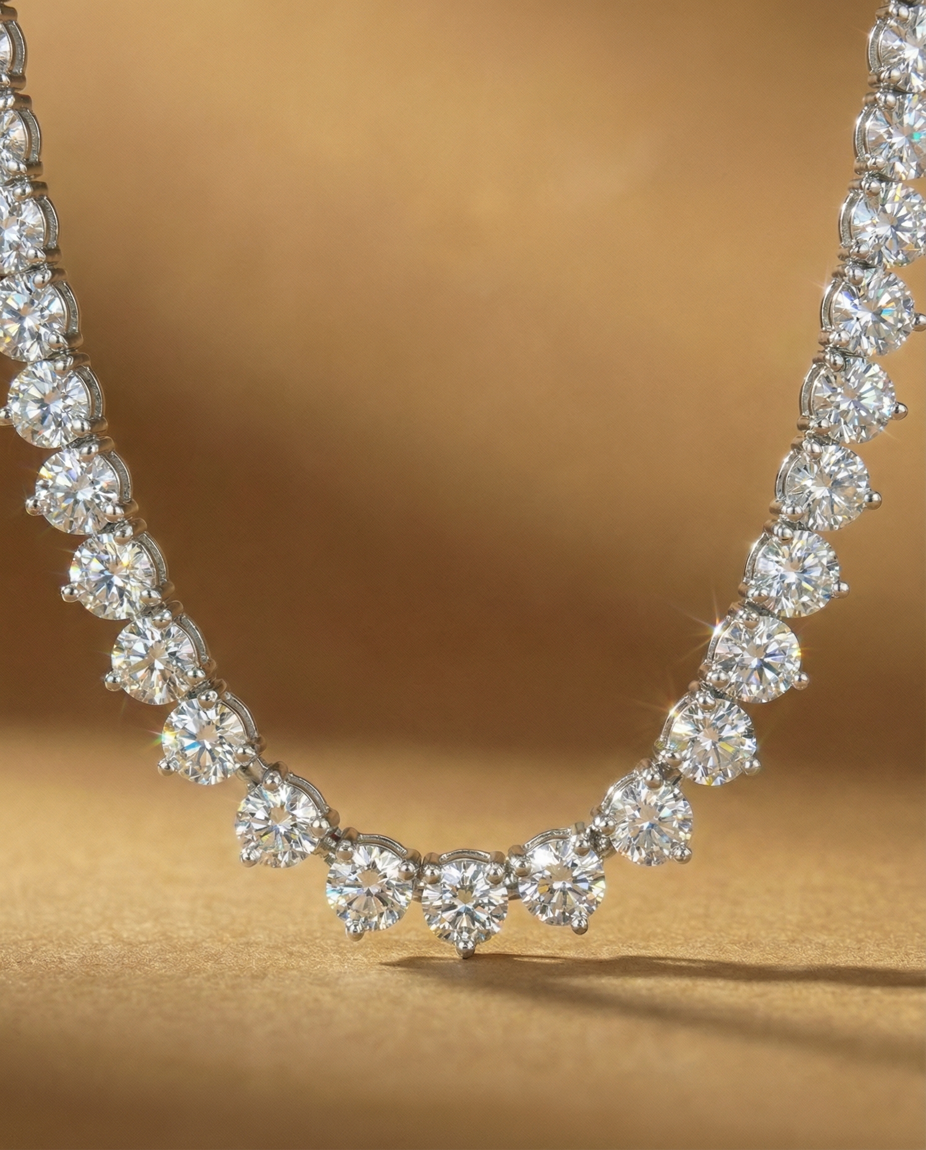 สร้อยคอเพชรทรงกลม (Round Tennis Necklace) สไตล์ไอคอนิกที่สะท้อนความเรียบหรูเหนือกาลเวลา เรียงร้อยด้วยเพชรน้ำงามเจียระไนเหลี่ยมกลมตลอดทั้งเส้น เปล่งประกายจับตาในทุกองศา เหมาะสำหรับสวมใส่เดี่ยวเพื่อความสง่างาม หรือแมทช์ซ้อนเลเยอร์เพื่อเพิ่มลูกเล่นให้กับลุคของคุณ