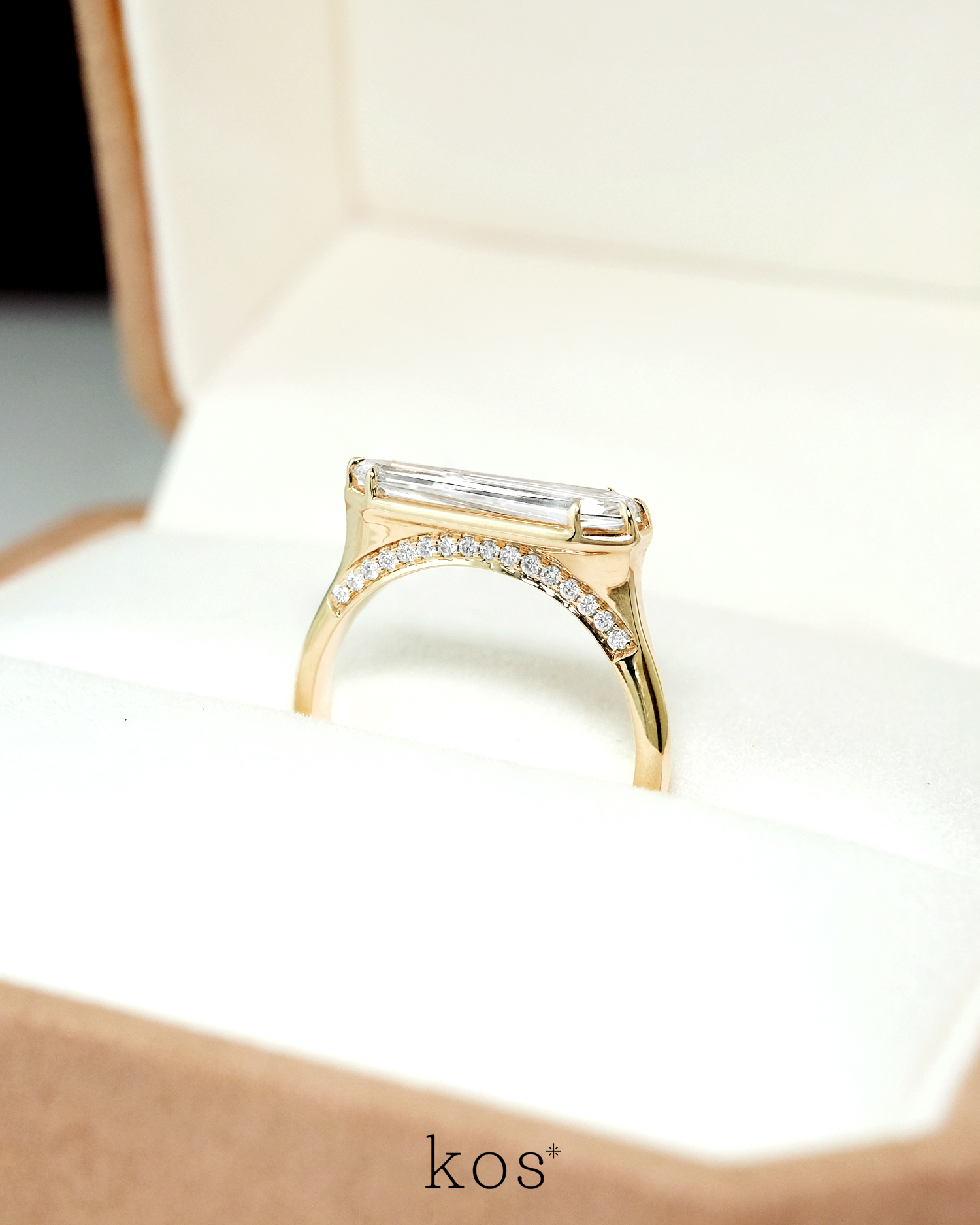 นิยามใหม่ของความเรียบหรูที่ไม่ซ้ำใคร ยกระดับความรักของคุณด้วยแหวนหมั้นดีไซน์โมเดิร์นจาก KOS Jewelry ที่ฉีกกฎแหวนหมั้นทรงกลมแบบเดิมๆ โดดเด่นด้วยเพชร Unique Cut เม็ดเดี่ยวที่วางในระนาบแนวนอน (East-West Setting) ผสมผสานกับงานดีไซน์เชิงสถาปัตยกรรมที่เน้นเส้นสายที่คมชัดและมั่นคง