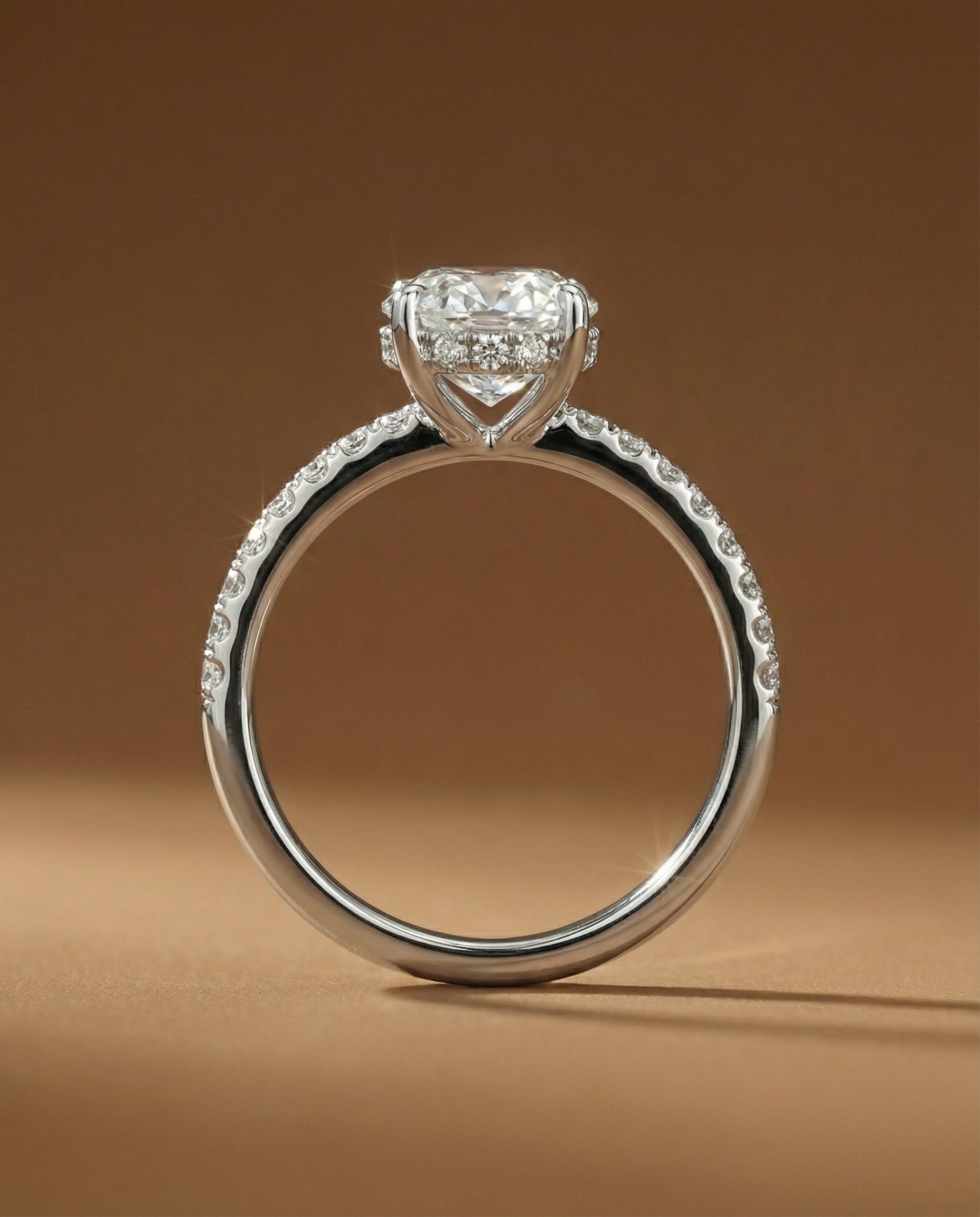 มอบประกายไฟที่เจิดจรัสที่สุดด้วยแหวนเพชรทรง Oval Cut น้ำงามบนตัวเรือนสุดประณีต โดดเด่นด้วยก้านแหวนฝังเพชรแบบ Pavé ที่ช่วยขับเน้นความระยิบระยับคู่ไปกับลูกเล่น Hidden Halo ใต้ฐานเพชรหลัก มอบลุคที่ดูหรูหรา อ่อนหวาน และทันสมัยในวงเดียว