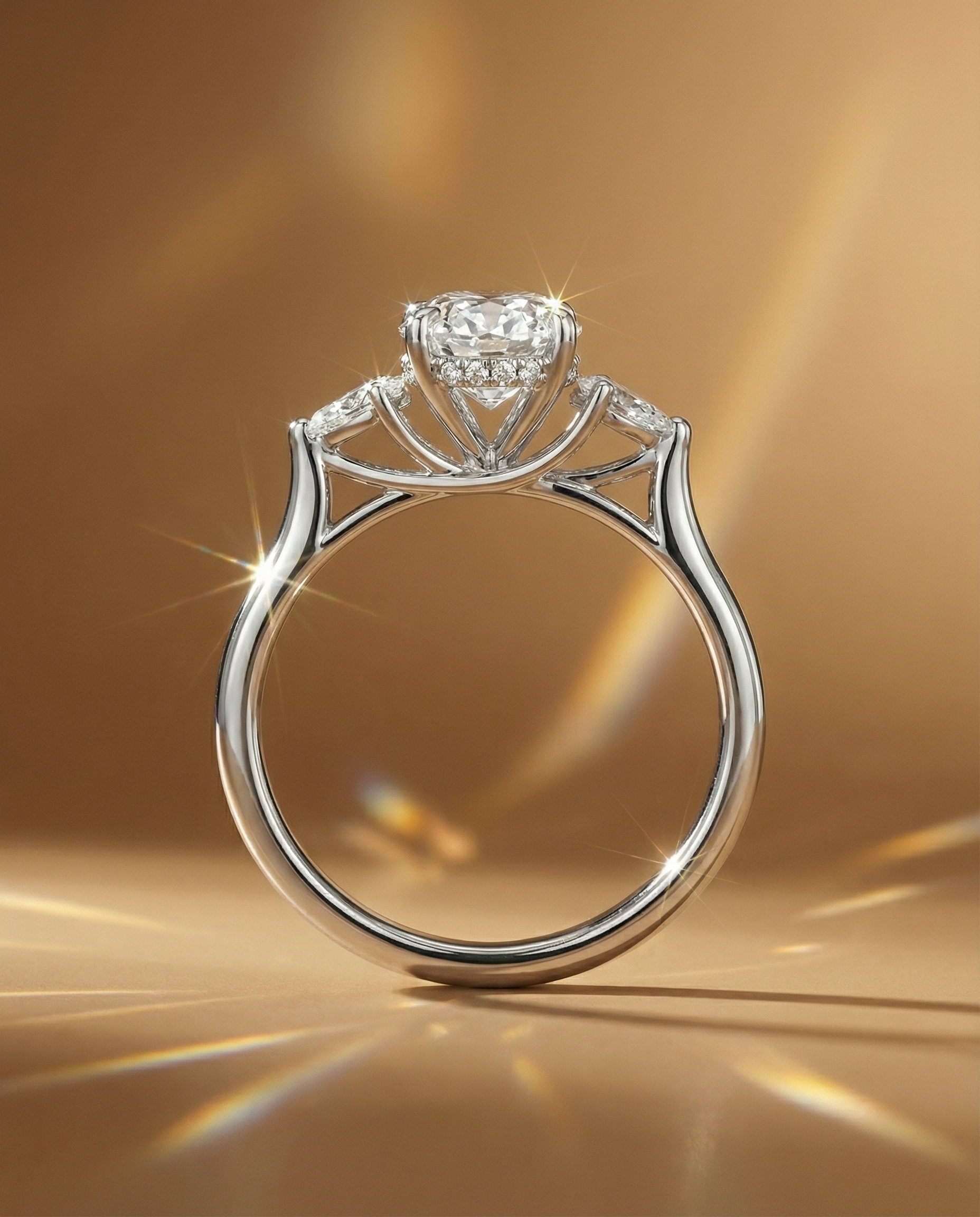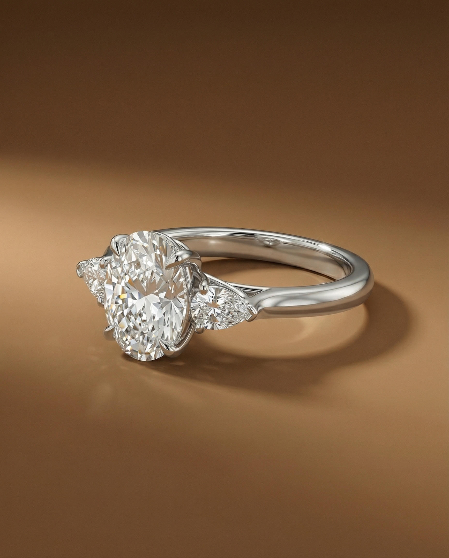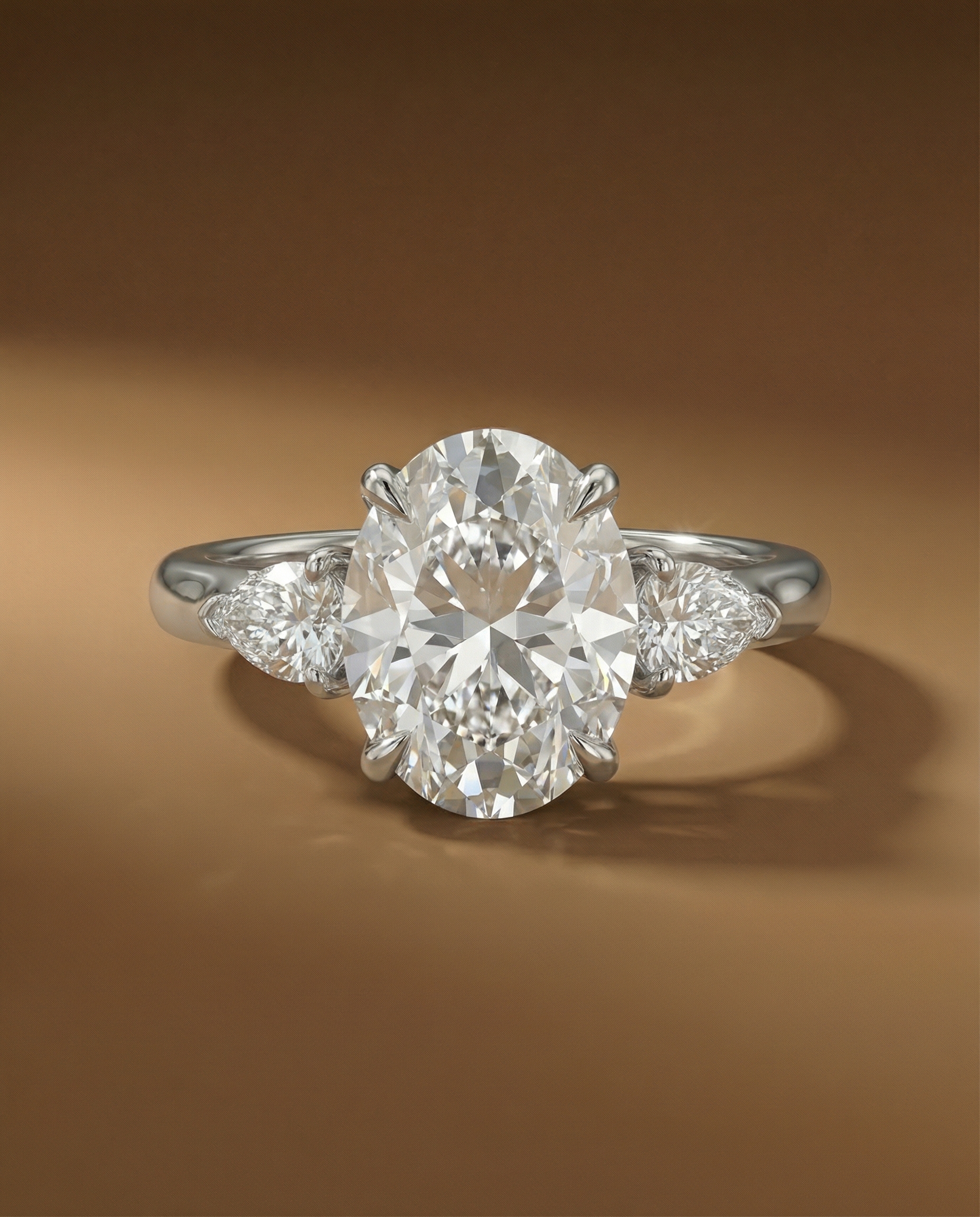 ค้นพบความงามที่เปี่ยมด้วยความหมายกับแหวนเพชรดีไซน์ Three-Stone สุดประณีต โดดเด่นด้วยเพชรเม็ดกลางทรง Oval Cut ที่รายล้อมด้วยเพชรทรงหยดน้ำ (Pear Cut) ทั้งสองข้าง มอบประกายระยิบระยับที่รับกับนิ้วมือได้อย่างสมบูรณ์แบบ ตัวแทนแห่งอดีต ปัจจุบัน และอนาคตที่แสนพิเศษของคุณ
