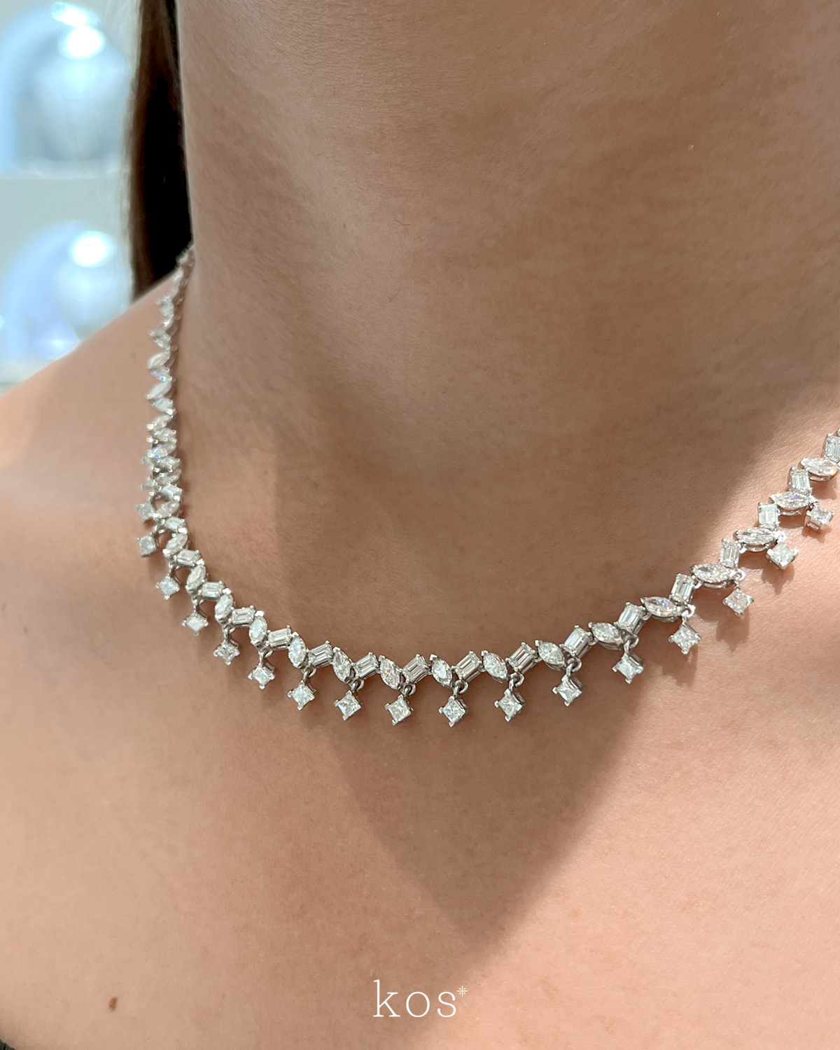 ผสานเพชรแท้หลากหลายรูปทรงเข้าด้วยกัน ทั้ง Princess Cut, Marquise Cut และ Emerald Cut อย่างลงตัว ตัวสร้อยเรียงร้อยต่อเนื่องกันอย่างประณีต