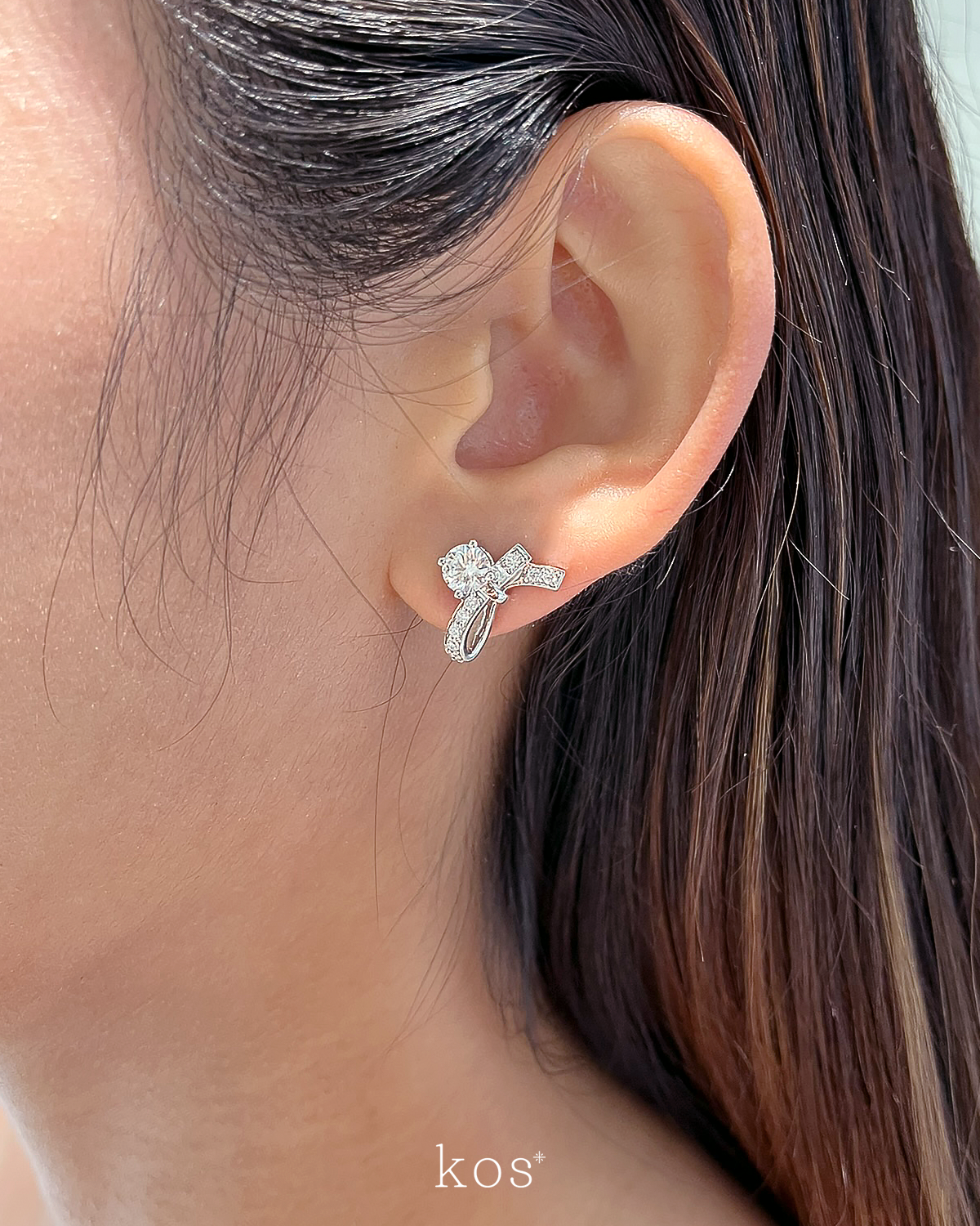 ต่างหูเพชรคู่นี้ถูกออกแบบมาอย่างพิถีพิถัน สะท้อนถึงความน่ารักอ่อนหวานและความหรูหราอย่างลงตัว ด้วยการออกแบบที่จำลองรูปทรงของโบว์หรือริบบิ้นที่กำลังพันรอบ เพชรเม็ดเดี่ยวทรงกลมบริสุทธิ์ สร้างความเปล่งประกายเจิดจรัสที่สะกดทุกสายตา