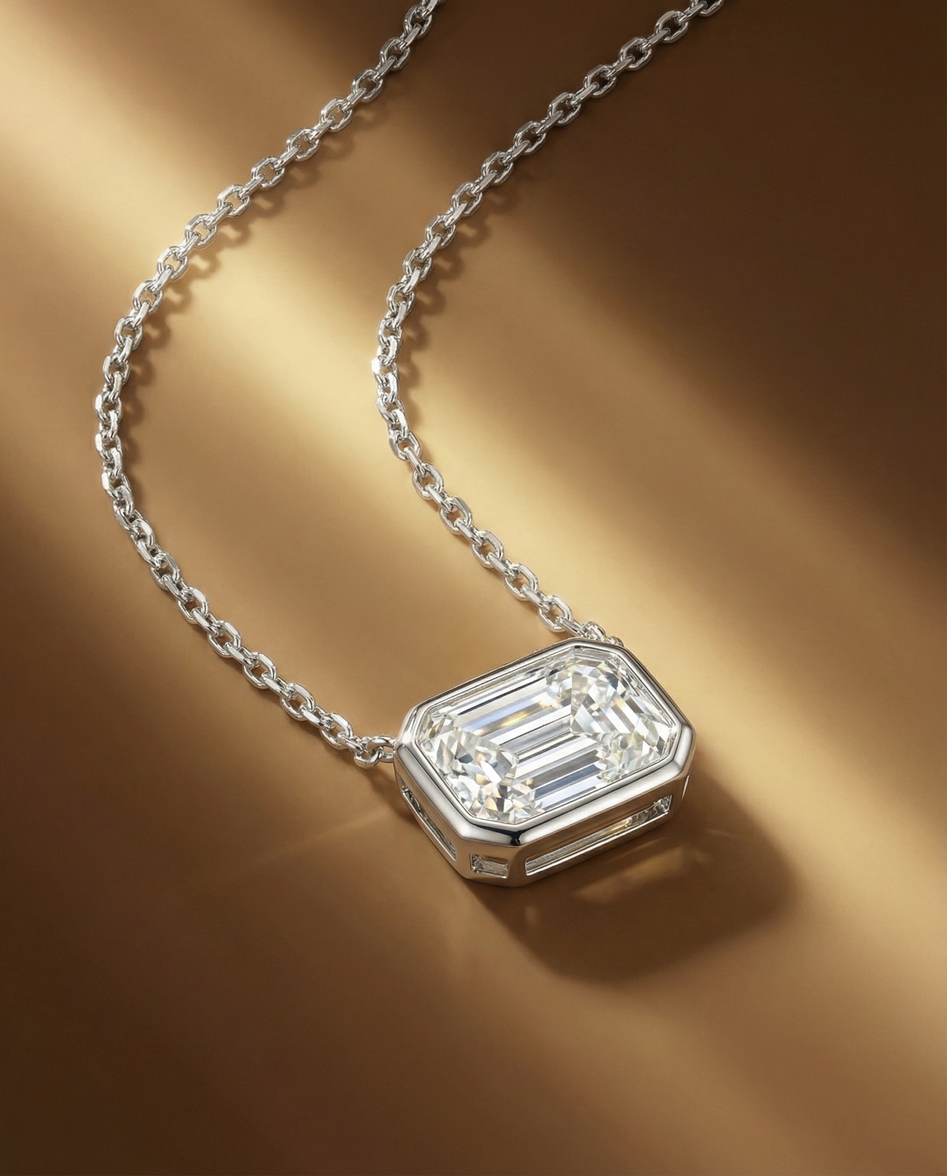 สัมผัสความงามที่สง่างามของ สร้อยจี้เพชร Emerald Cut ที่มอบประกายแบบ Step Cut ที่คมชัดและหรูหรา ตัวเรือน White Gold ถูกออกแบบมาให้เพชรดูเรียบเนียนและโดดเด่น เหมาะอย่างยิ่งสำหรับผู้ที่ชื่นชอบเครื่องประดับเพชรที่มีลุคคลาสสิก ชัดเจน และมีสไตล์แบบ Art Deco