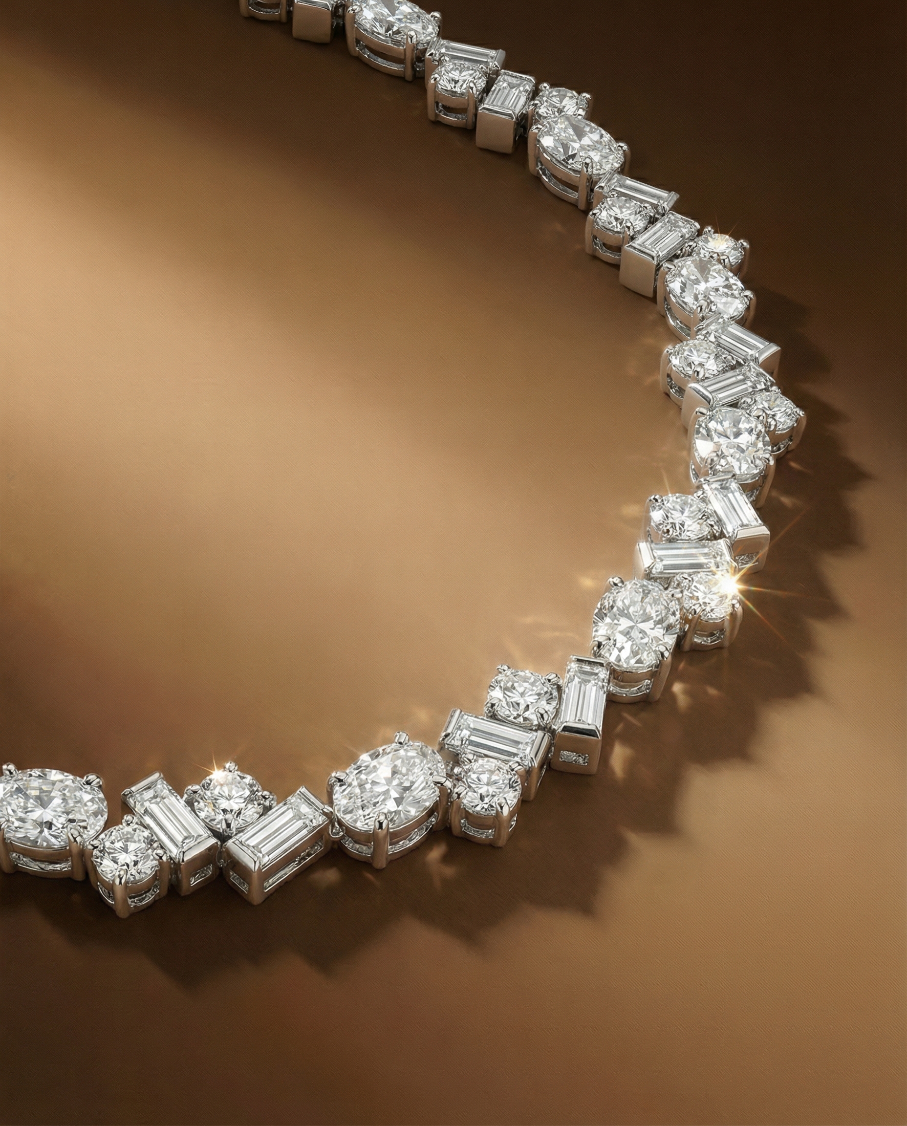 ยกระดับลุคด้วยสร้อยคอเพชรดีไซน์ร่วมสมัย ที่ผสมผสานความเจิดจรัสของเพชรทรงกลม เพชรไข่ และความสง่างามของเพชรทรง Baguette Cut เข้าด้วยกันอย่างลงตัว การจัดเรียงเพชรหลากรูปทรงนี้สร้างมิติที่น่าสนใจและประกายที่แตกต่างกันในทุกองศา มอบความรู้สึกหรูหราแบบใหม่และทันสมัย เหมาะสำหรับผู้ที่ชื่นชอบเครื่องประดับที่มีเอกลักษณ์และไม่ซ้ำใคร