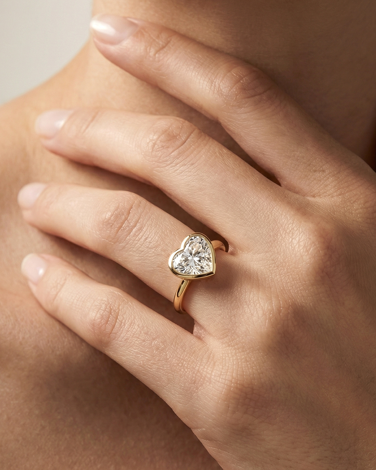 สัมผัสความงามเหนือกาลเวลาที่ผสานความรักอันบริสุทธิ์เข้ากับความหรูหราร่วมสมัย แหวนเพชรรูปหัวใจขนาด 4.5 กะรัต เจียระไนอย่างสมบูรณ์แบบในตัวเรือนแบบ Bezel Setting ที่โอบอุ้มเพชรไว้อย่างอ่อนโยน มอบประกายระยิบระยับไร้ที่ติในทุกมุมมอง ดีไซน์เรียบหรูเหนือกาลเวลา พร้อมสะกดทุกสายตาให้หลงใหลในทุกครั้งที่สวมใส่