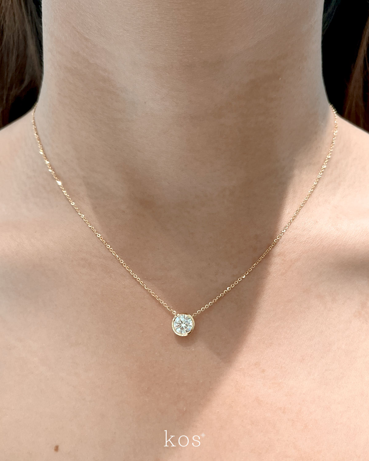 สัมผัสความงามที่เรียบง่ายแต่ทรงพลังด้วย สร้อยเพชรแท้เม็ดเดี่ยวทรงกลม โดดเด่นด้วยการฝังเพชรแบบหุ้ม (Bezel Setting) ซึ่งช่วยปกป้องเพชรได้อย่างดีเยี่ยม