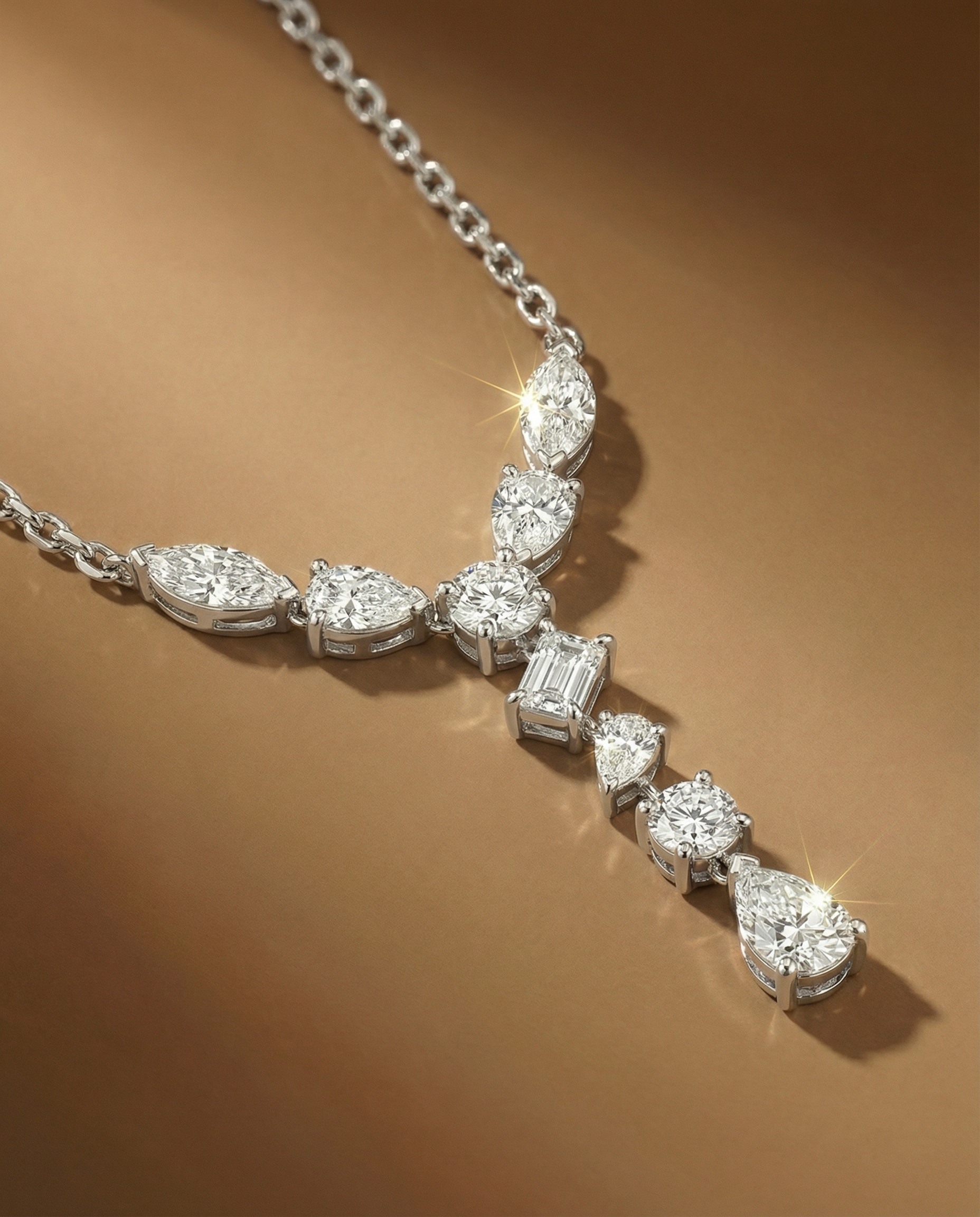 สร้อยคอเพชรดีไซน์ร่วมสมัย ที่ผสานความเรียบง่ายเข้ากับความหรูหราได้อย่างลงตัว โดดเด่นด้วยเพชรรูปทรงหลากหลายที่เรียงร้อยอย่างมีจังหวะ จบด้วยหยดน้ำเม็ดงามที่ปลายสายราวหยาดน้ำตาแห่งความสง่างาม เหมาะสำหรับลุคเรียบหรู ที่แฝงด้วยเสน่ห์เฉพาะตัว