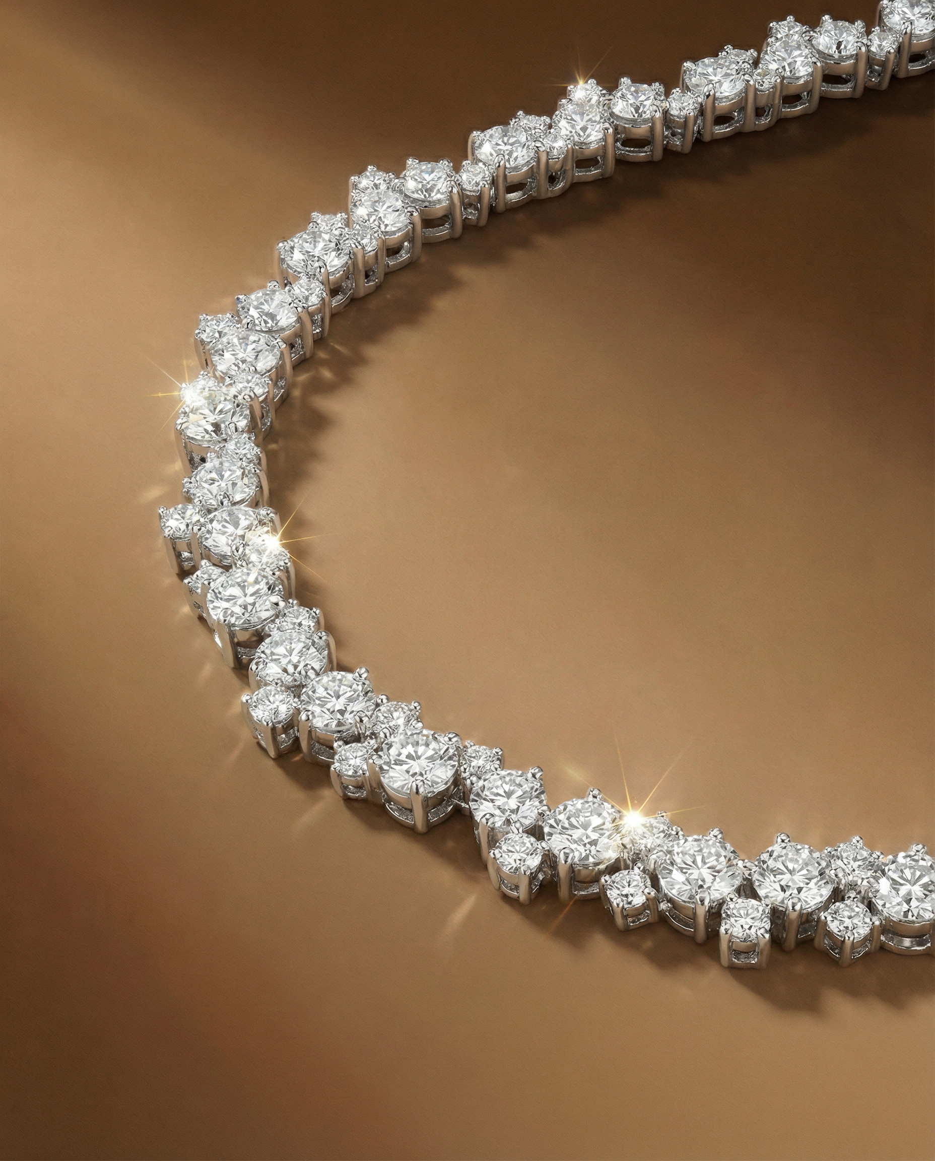 สร้อยคอเพชรดีไซน์กลุ่มดาวที่เปล่งประกายระยิบระยับตลอดทั้งเส้น การจัดเรียงเพชรทรงกลมหลายขนาด (Cluster Setting) ให้ดูไม่เป็นระเบียบอย่างมีศิลปะ ทำให้สร้อยเส้นนี้ดูอ่อนช้อยและมีชีวิตชีวา มอบประกายแสงที่นุ่มนวลและเย้ายวนใจ เหมาะสำหรับสวมใส่ได้ทุกวัน หรือในโอกาสที่ต้องการความหรูหราแบบเบาๆ