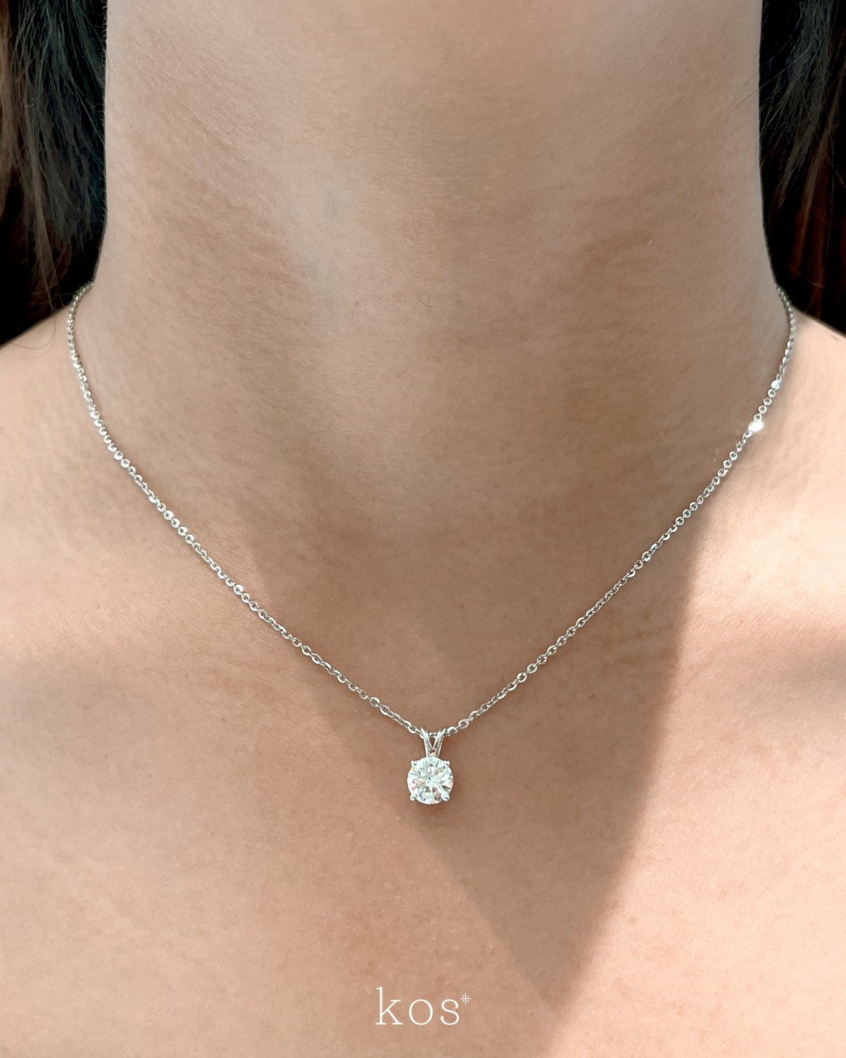 สร้อยเพชรเม็ดเดี่ยวทรงกลม ดีไซน์คลาสสิกเหนือกาลเวลาจาก KOS Jewelry เพชรน้ำงามถูกฝังแบบ 4 หนามเตย ที่โชว์ความสมบูรณ์แบบและประกายไฟของเพชรได้เต็มที่