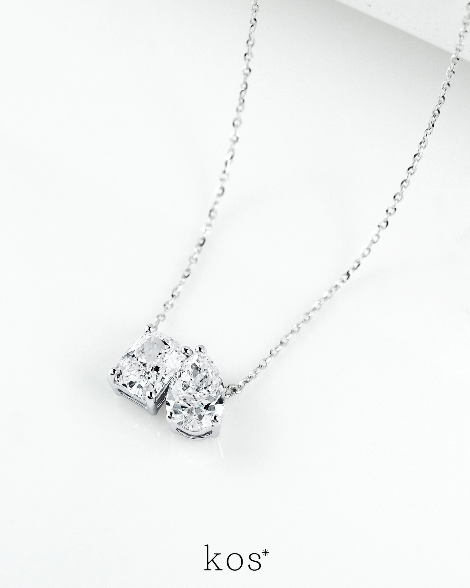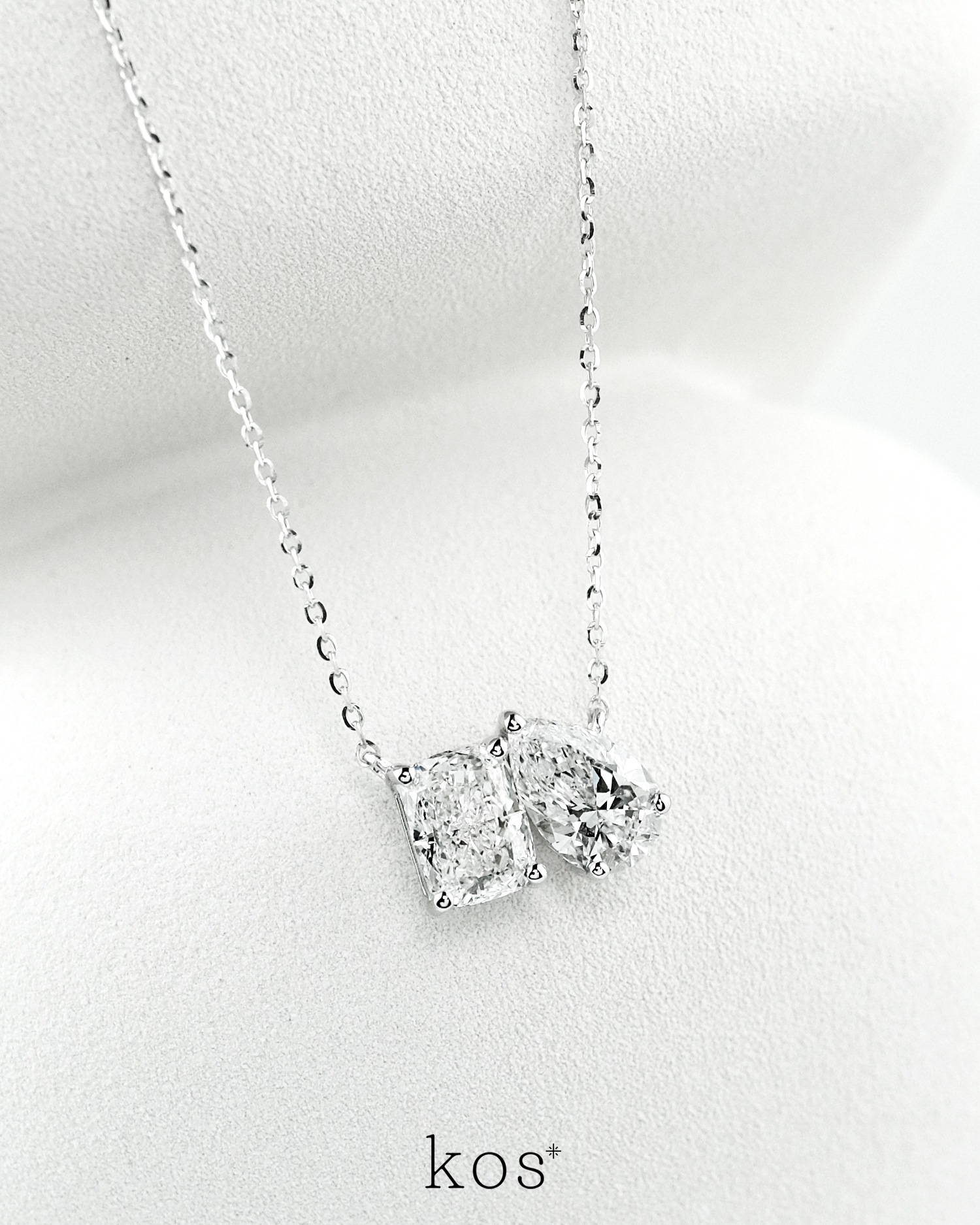 สร้อยคอเพชร The Duality เส้นนี้เป็นตัวแทนของความลงตัวที่แตกต่างอย่างมีสไตล์ ด้วยการจับคู่เพชรแท้เจียระไนสองรูปทรงที่ไม่เหมือนใครอย่าง