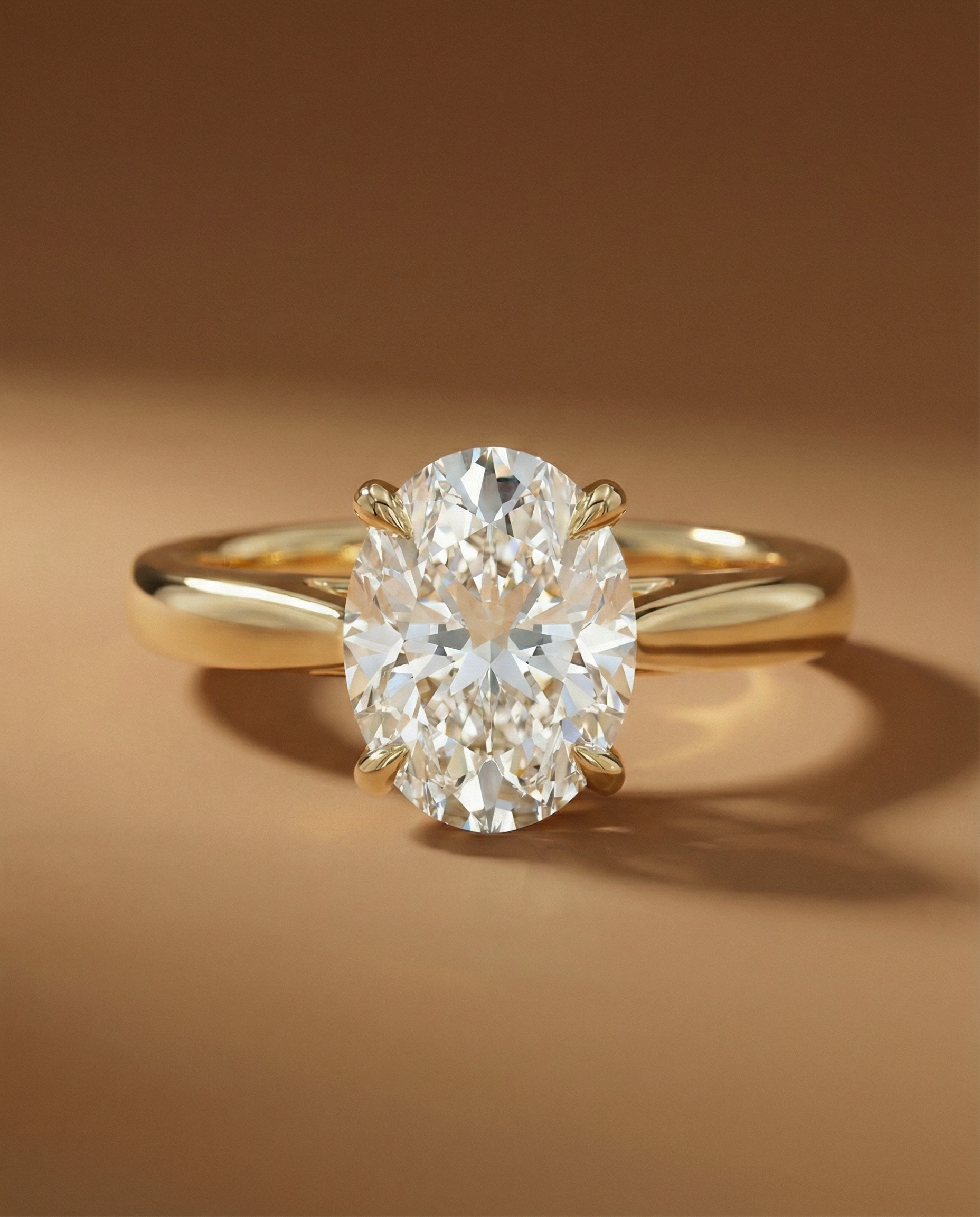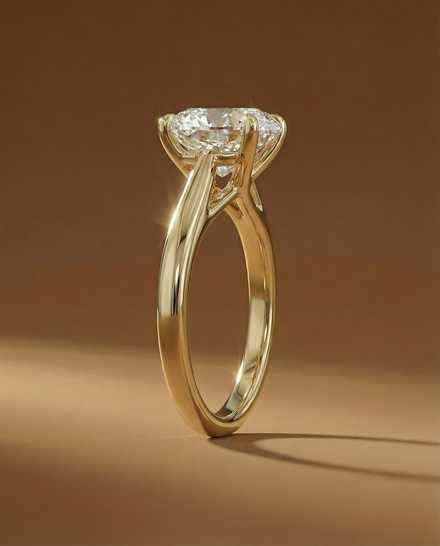 นิยามแห่งความรักที่ยั่งยืนกับ แหวนเพชรเม็ดเดี่ยว Oval ที่เปล่งประกายไฟอย่างสมบูรณ์แบบ ตัวเรือนทอง ดีไซน์พิเศษด้วยก้านแหวนแบบ Cathedral ที่ไขว้ประสานกันใต้ฐานเพชร มอบความสง่างามที่ดูภูมิฐานและทรงพลังในทุกมุมมอง