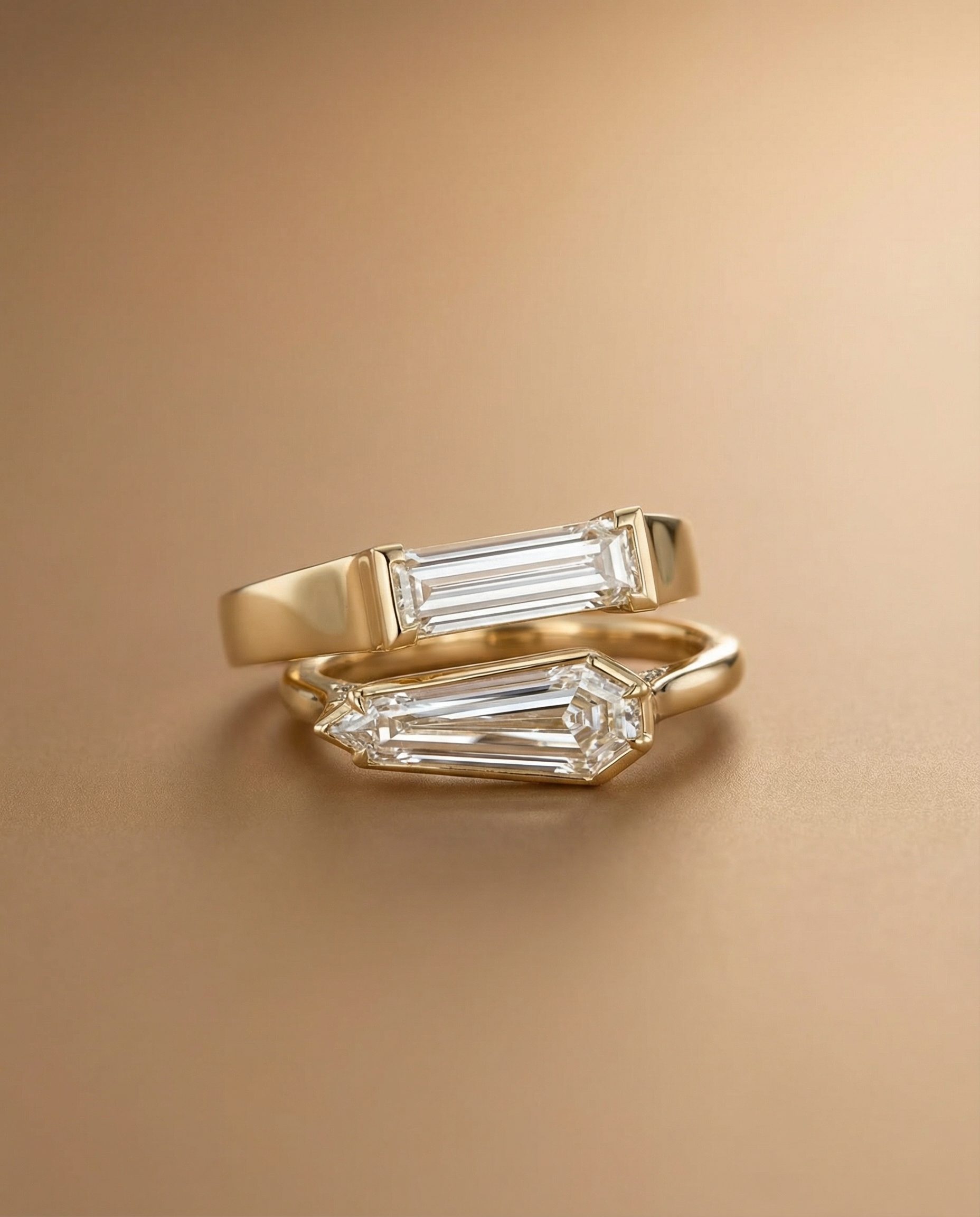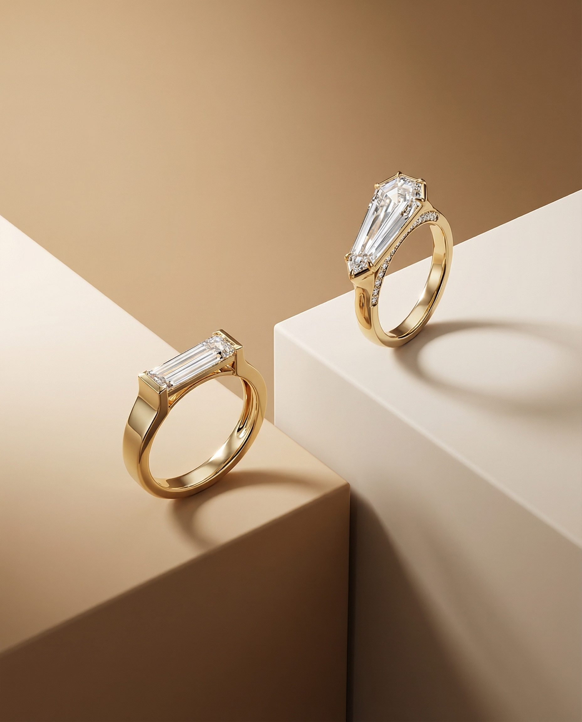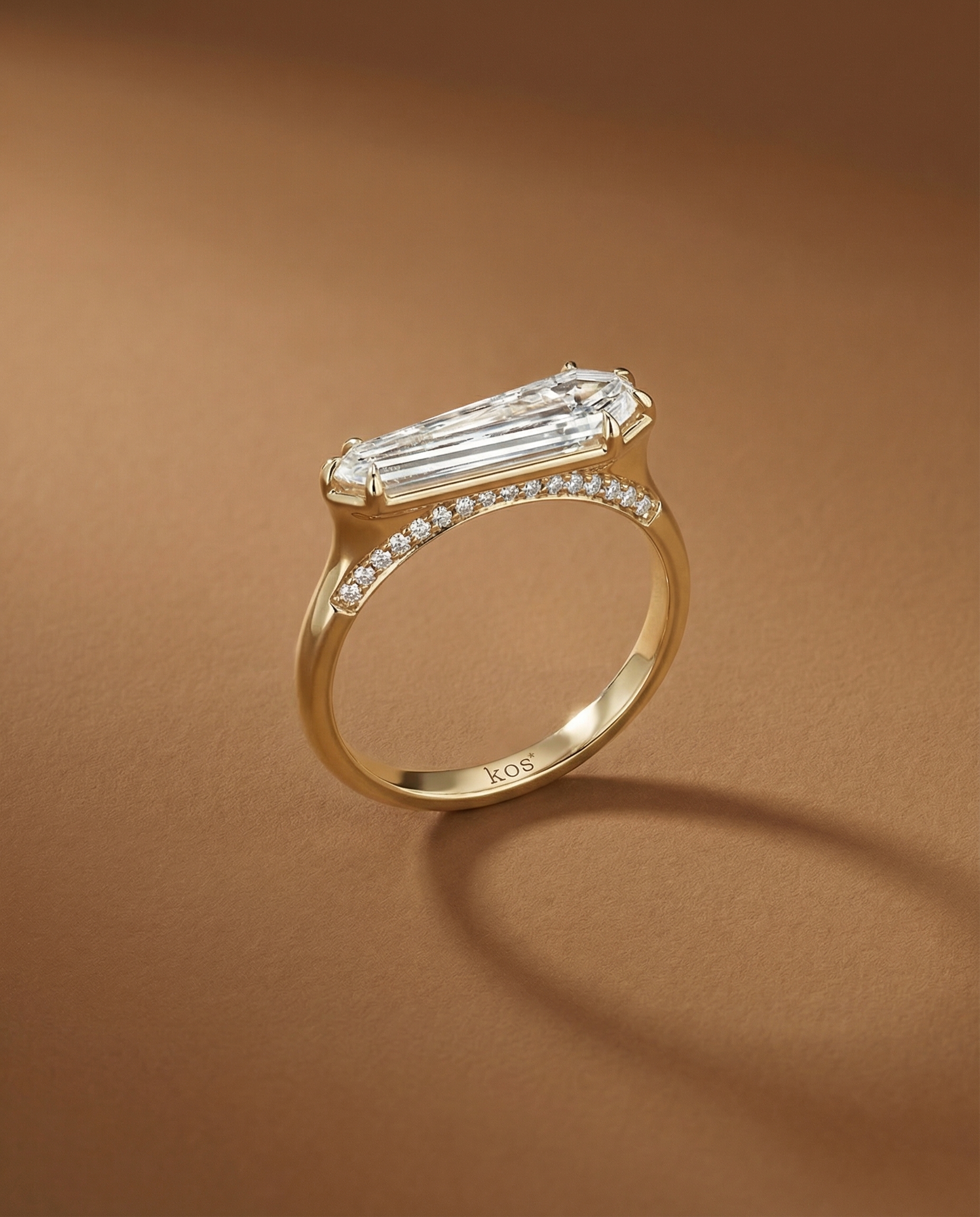 นิยามใหม่ของความเรียบหรูที่ไม่ซ้ำใคร ยกระดับความรักของคุณด้วยแหวนหมั้นดีไซน์โมเดิร์นจาก KOS Jewelry ที่ฉีกกฎแหวนหมั้นทรงกลมแบบเดิมๆ โดดเด่นด้วยเพชร Unique Cut เม็ดเดี่ยวที่วางในระนาบแนวนอน (East-West Setting) ผสมผสานกับงานดีไซน์เชิงสถาปัตยกรรมที่เน้นเส้นสายที่คมชัดและมั่นคง