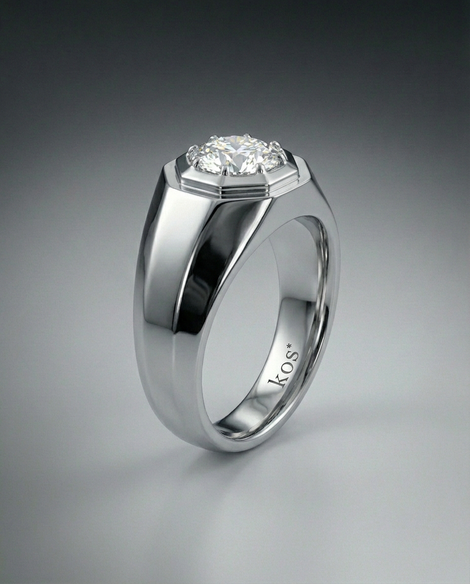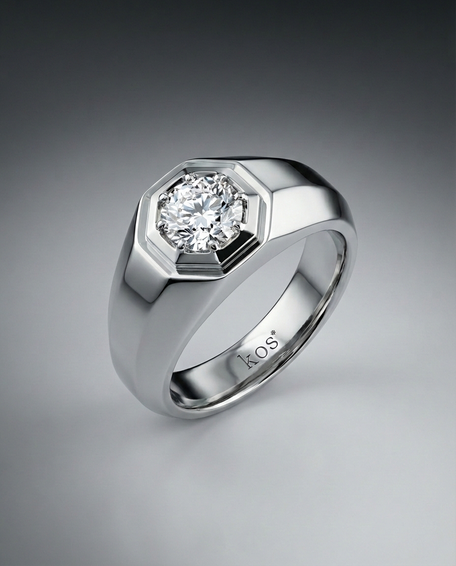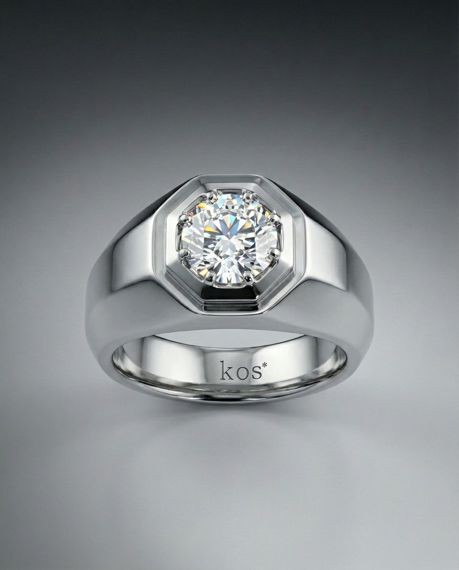 แหวนผู้ชายดีไซน์ทรงแปดเหลี่ยมอันทรงพลัง มาพร้อมเพชรเจียระไนทรงกลมฝังแน่นอยู่ในกรอบเหลี่ยมแบบมั่นคง สื่อถึงความแข็งแกร่ง ความมั่นคง และการเป็นศูนย์กลางของทุกสิ่ง