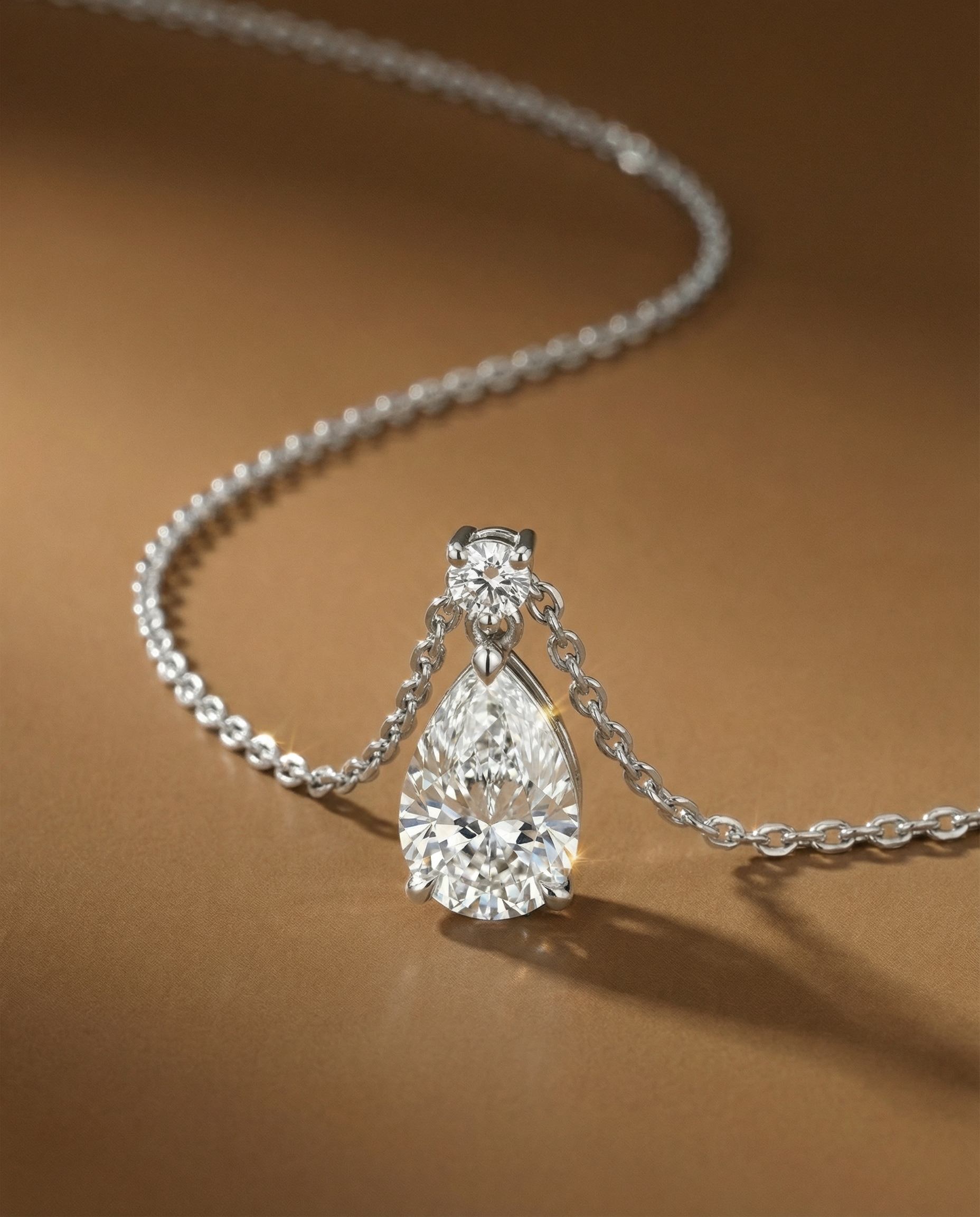 เพิ่มความสง่างามให้กับทุกลุคด้วย สร้อยเพชรแท้เม็ดเดี่ยวทรงหยดน้ำ (Pear Cut) ตัวเรือน ทองคำขาว (White Gold) ออกแบบมาให้โชว์ประกายเพชรได้สูงสุด ดีไซน์คลาสสิกที่ยังคงความทันสมัย เหมาะอย่างยิ่งสำหรับผู้ที่ต้องการเครื่องประดับเพชรที่มีเอกลักษณ์และหรูหราไม่ซ้ำใคร