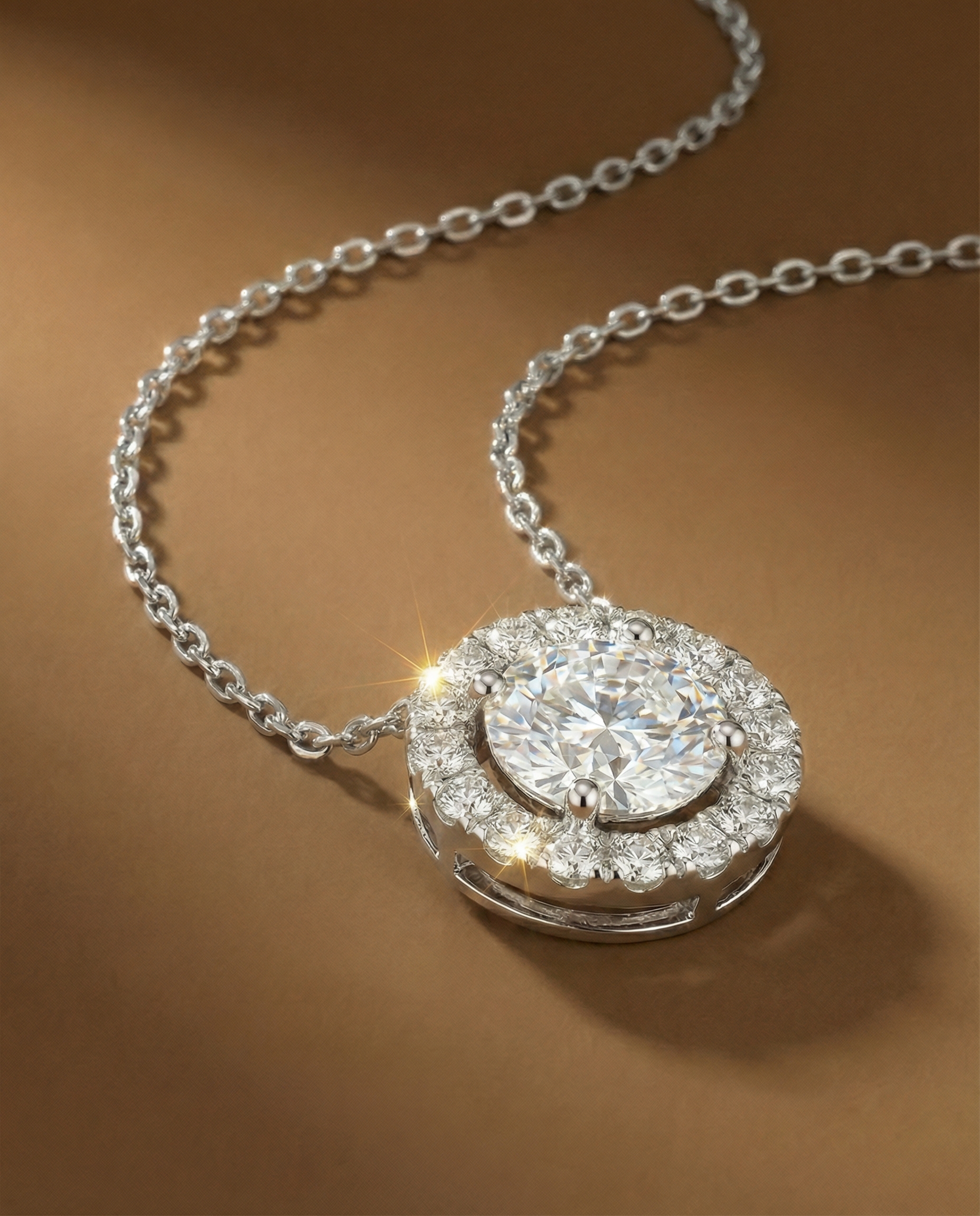 สัมผัสประกายเพชรที่สว่างเจิดจรัสด้วย สร้อยเพชรแท้ล้อมเพชร ดีไซน์คลาสสิกที่นำเพชรทรงกลมเม็ดกลางมาล้อมรอบด้วยเพชรเม็ดเล็ก ทำให้จี้ดูมีขนาดใหญ่ขึ้นและเปล่งประกายสูงสุด