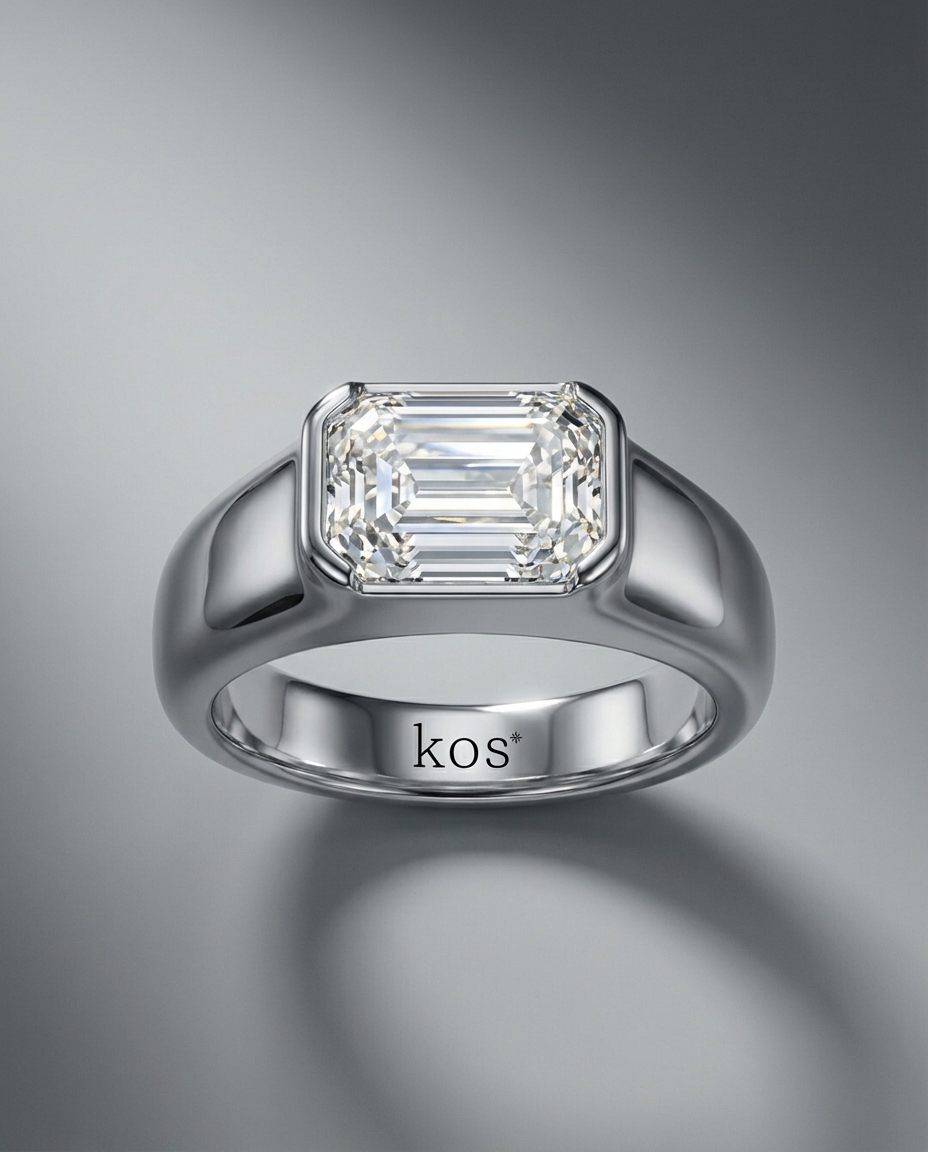 สัมผัสความหรูหราที่อยู่เหนือกาลเวลา แหวนรุ่นนี้ถูกออกแบบมาเพื่อชูความโดดเด่นของเพชรทรงเหลี่ยม Emerald ผสมผสานกับงานขัดเงาตัวเรือนที่ประณีตที่สุด
