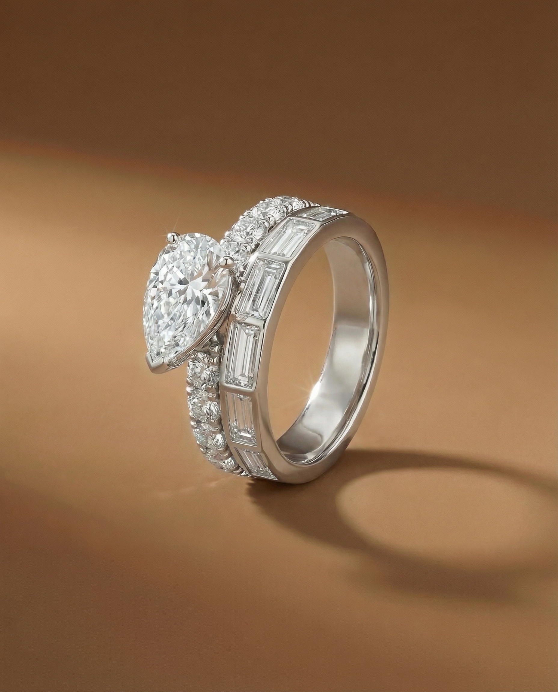 สัมผัสความเลอค่าที่เป็นเอกลักษณ์กับ “The Royal Pear Ring” แหวนเพชรที่ฉีกกฎดีไซน์แบบเดิมๆ ด้วยการวางเพชรเม็ดกลางทรงหยดน้ำ (Pear Cut) ในแนวนอน หรือ East-West Setting มอบลุคที่ดูโมเดิร์น โฉบเฉี่ยว