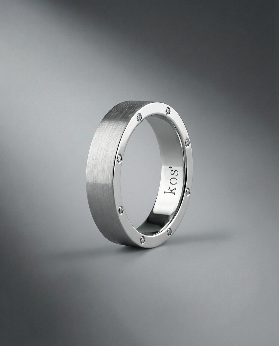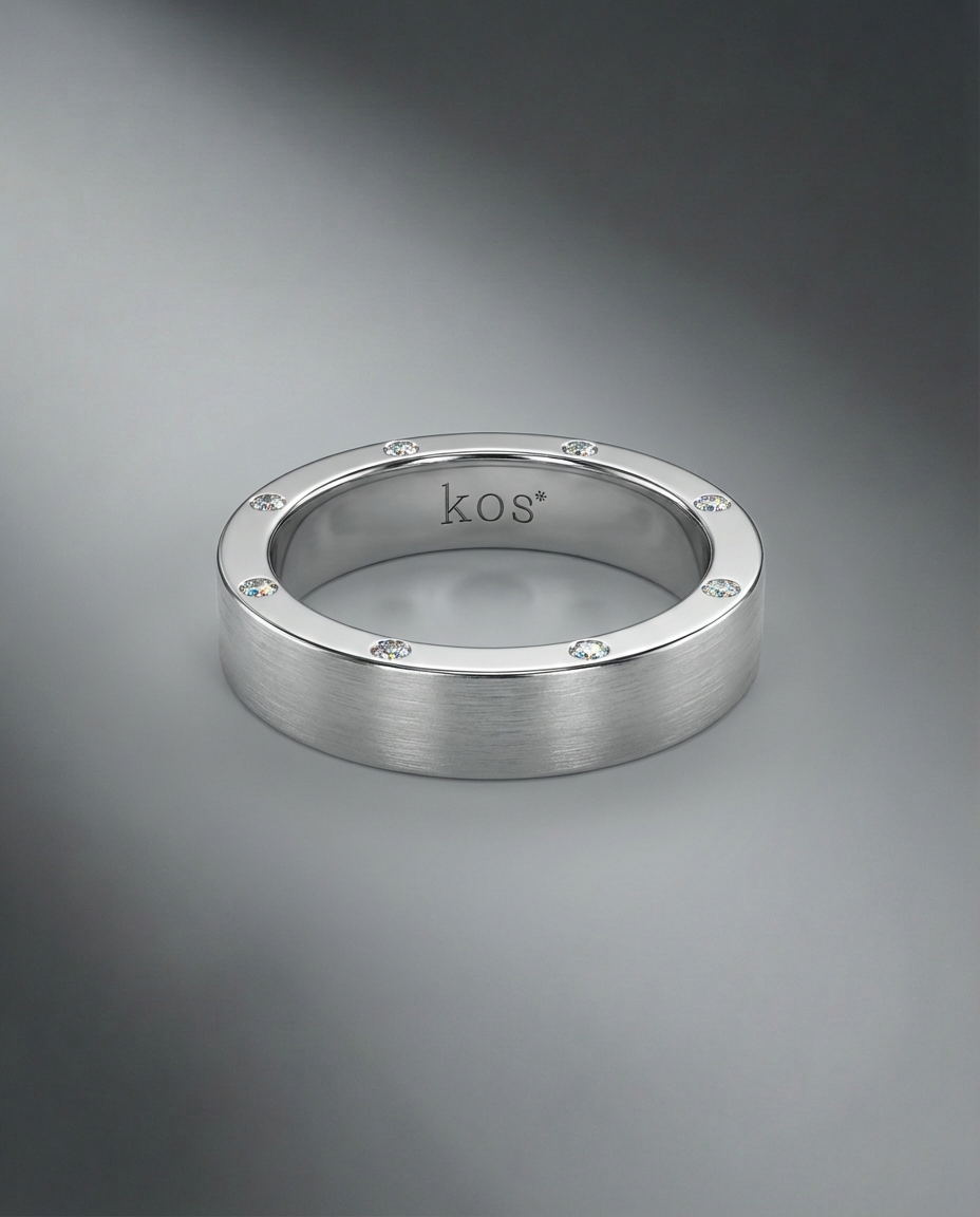 ยกระดับสไตล์ให้ดูภูมิฐานและทันสมัยด้วย แหวนผู้ชายจากแบรนด์ KOS ที่ออกแบบมาเพื่อผู้ชายยุคใหม่ที่ต้องการความเรียบง่ายแต่แฝงไปด้วยรายละเอียด ความพิเศษของแหวนวงนี้อยู่ที่การผสมผสานระหว่าง ความดิบและความเนี๊ยบ ด้วยตัวเรือนหน้ากว้างทรง Flat Band ที่เน้นพื้นผิวสัมผัสแบบ Brushed Finish ให้ลุคที่ดูสปอร์ตและช่วยพรางรอยขีดข่วนจากการใช้งานได้ดี ตัดกับขอบแหวนแบบเงา ที่ฝังเพชรเรียงรายอยู่รอบวงด้านข้าง มอบความระยิบระยับแบบไม่เอะอะ จะมองจากมุมไหนก็สะดุดตา