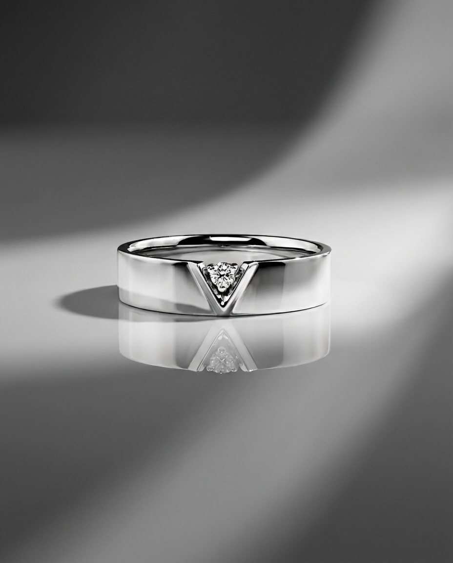 แหวนผู้ชายดีไซน์โมเดิร์นสุดเรียบหรู ตัวเรือนเงินเงางามสะท้อนแสงทุกมุมมอง โดดเด่นด้วยเพชรทรงกลมฝังในร่องตัว V กลางวง สื่อถึงความแข็งแกร่งที่ซ่อนความละเอียดอ่อนไว้ภายใน — เหมาะสำหรับผู้ชายที่มีความมั่นใจและคลาสสิกในตัวเอง