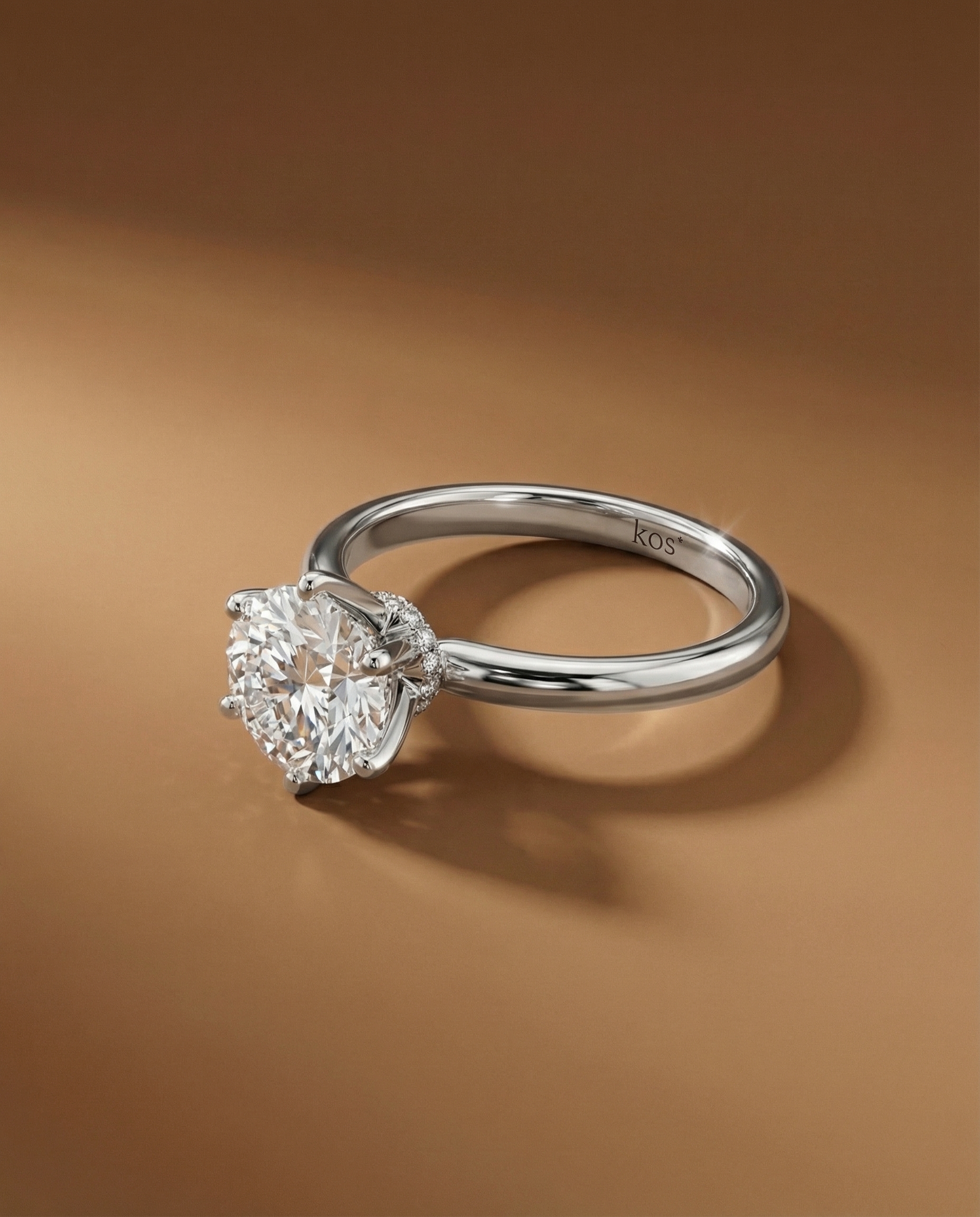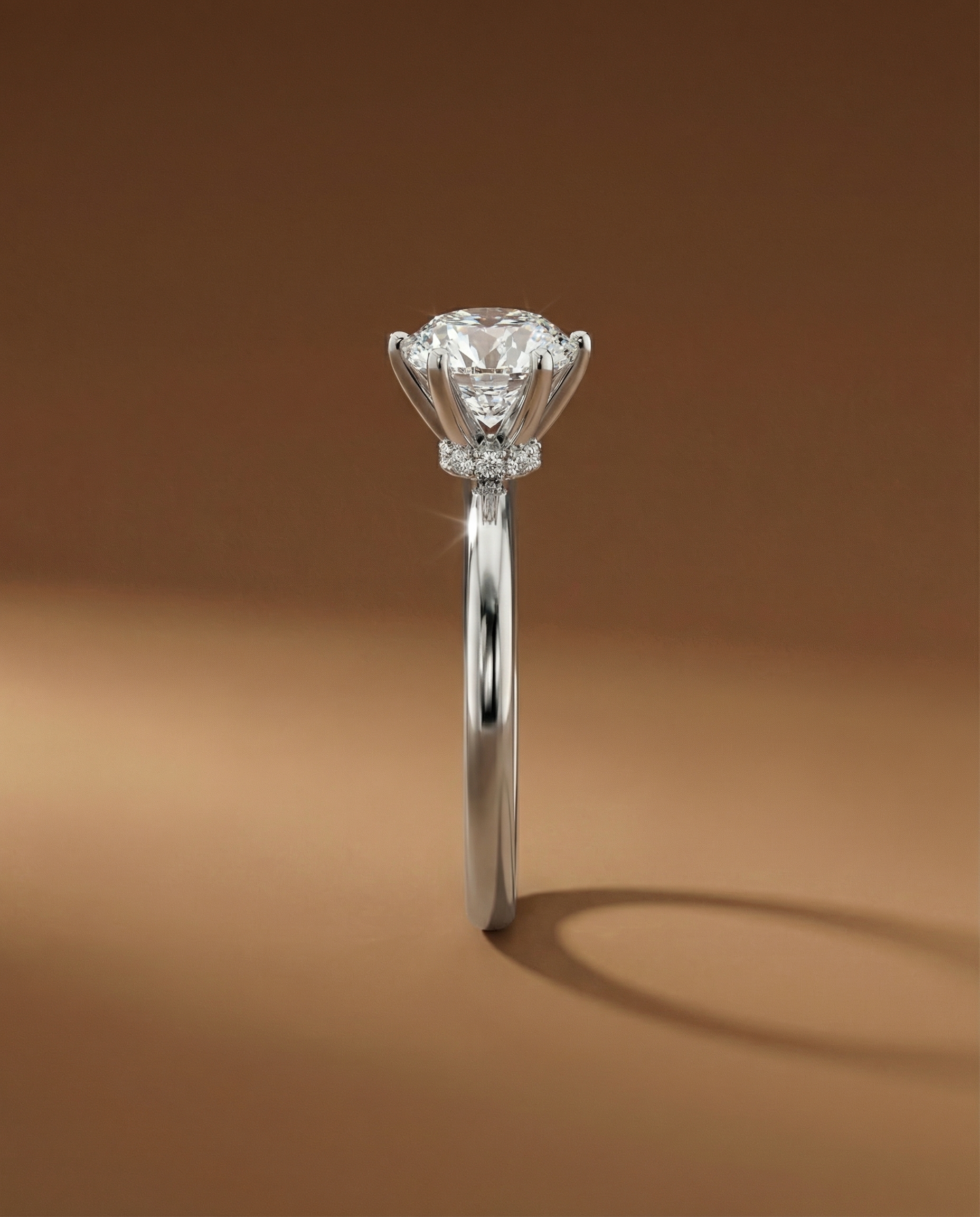 แหวนแต่งงาน ดีไซน์ Classic ที่มีดีเทลเพชรล้อมรอบกระเปาะเพชร ตัวเรือนเรียบ เน้นให้เพชรโดดเด่น และหรูหรา ให้ลุค Timeless Chic